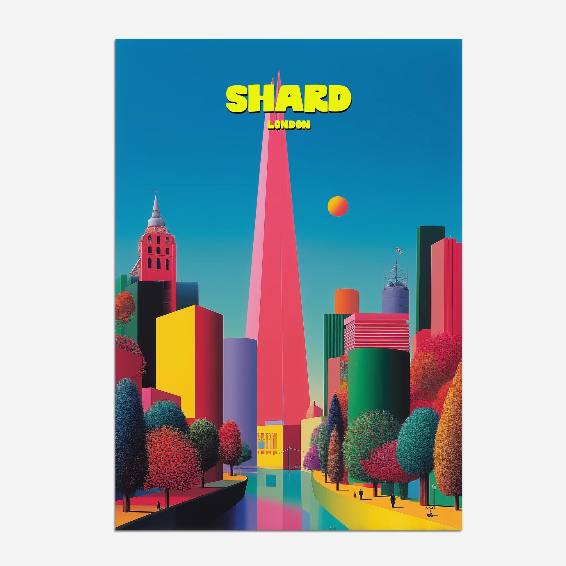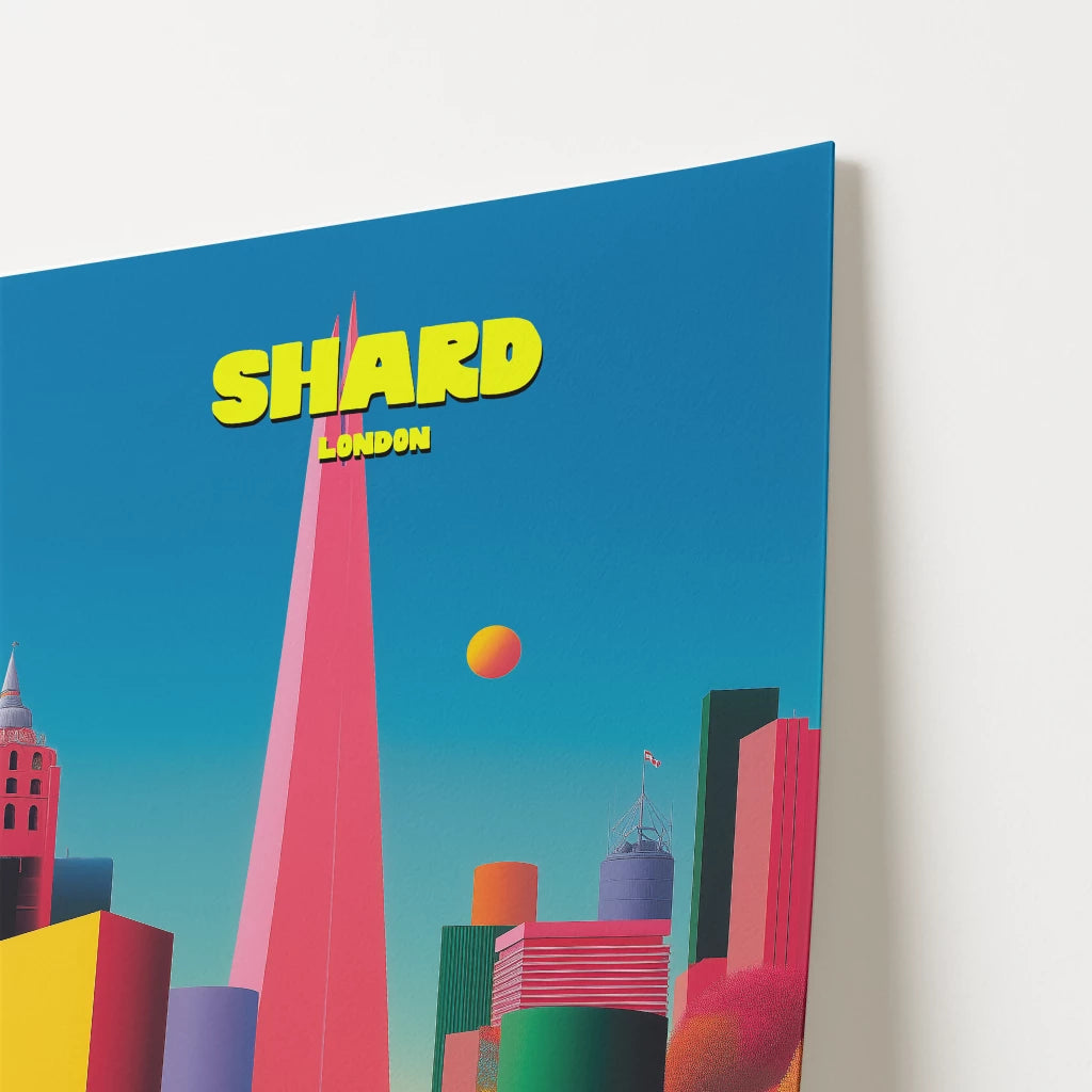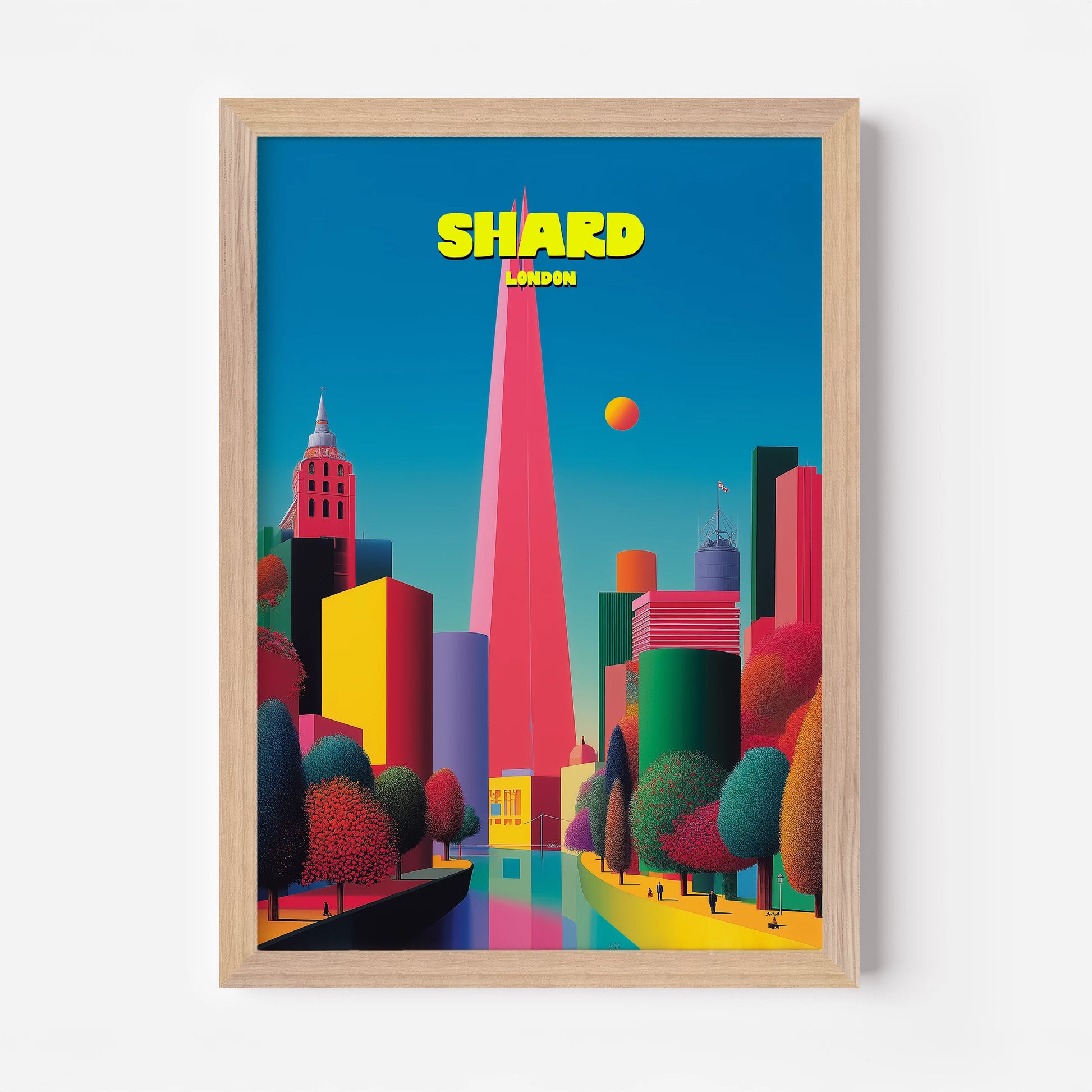 This vibrant London travel poster showcases The Shard soaring high above the city skyline. The sharp pink tower contrasts beautifully against a bright turquoise sky, with surrounding buildings in vivid tones of yellow, green, red, and purple. Lush trees in deep emerald and crimson add warmth to the futuristic scene. A bold celebration of modern London, this print captures the capital in playful, pop-art style. Ideal for London lovers or collectors of colourful travel posters.