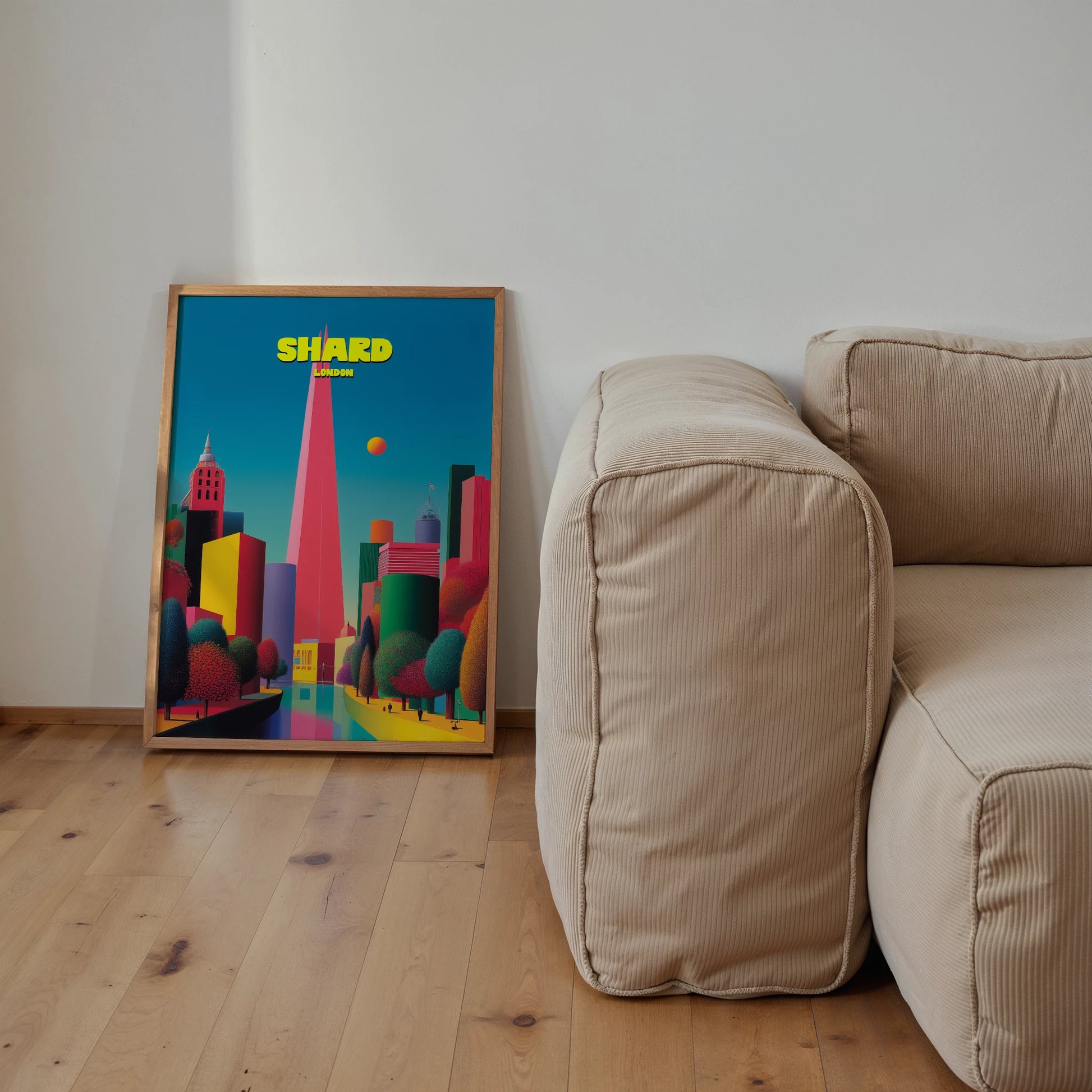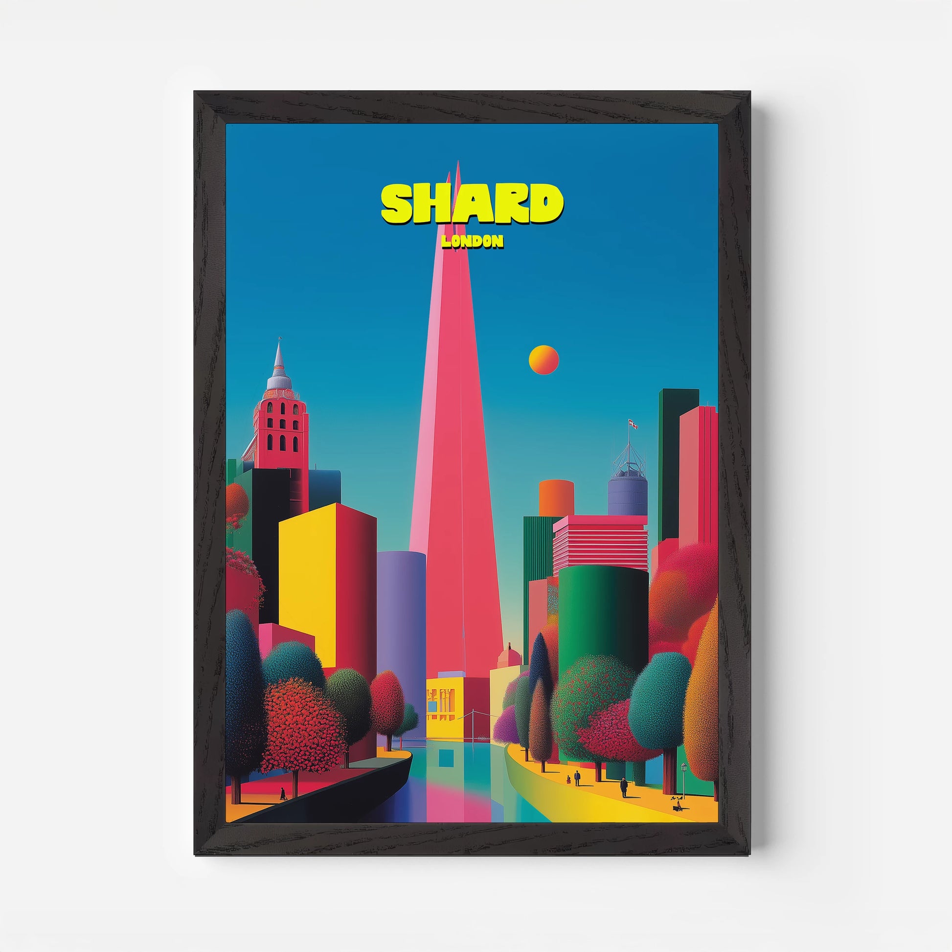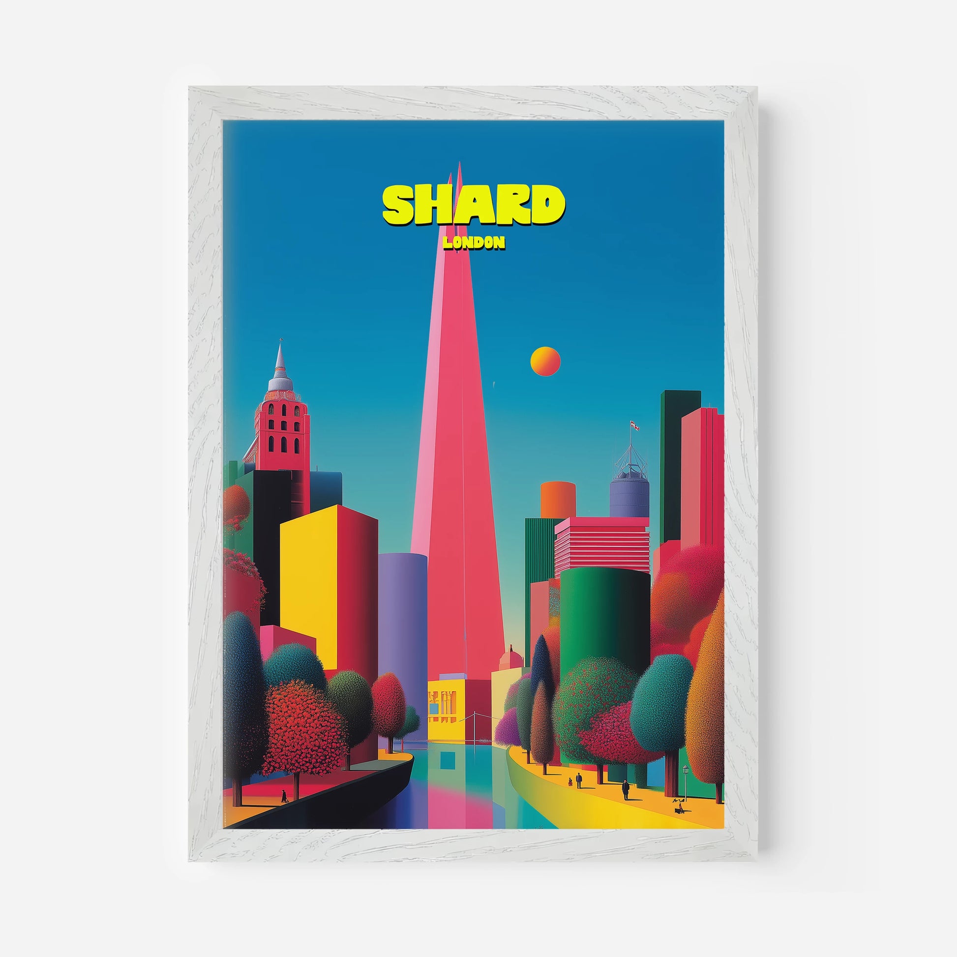 This vibrant London travel poster showcases The Shard soaring high above the city skyline. The sharp pink tower contrasts beautifully against a bright turquoise sky, with surrounding buildings in vivid tones of yellow, green, red, and purple. Lush trees in deep emerald and crimson add warmth to the futuristic scene. A bold celebration of modern London, this print captures the capital in playful, pop-art style. Ideal for London lovers or collectors of colourful travel posters.