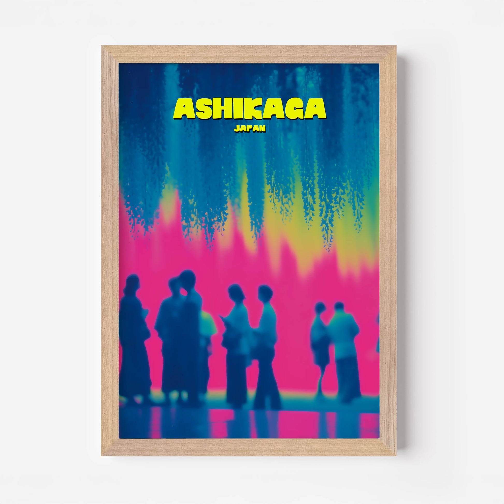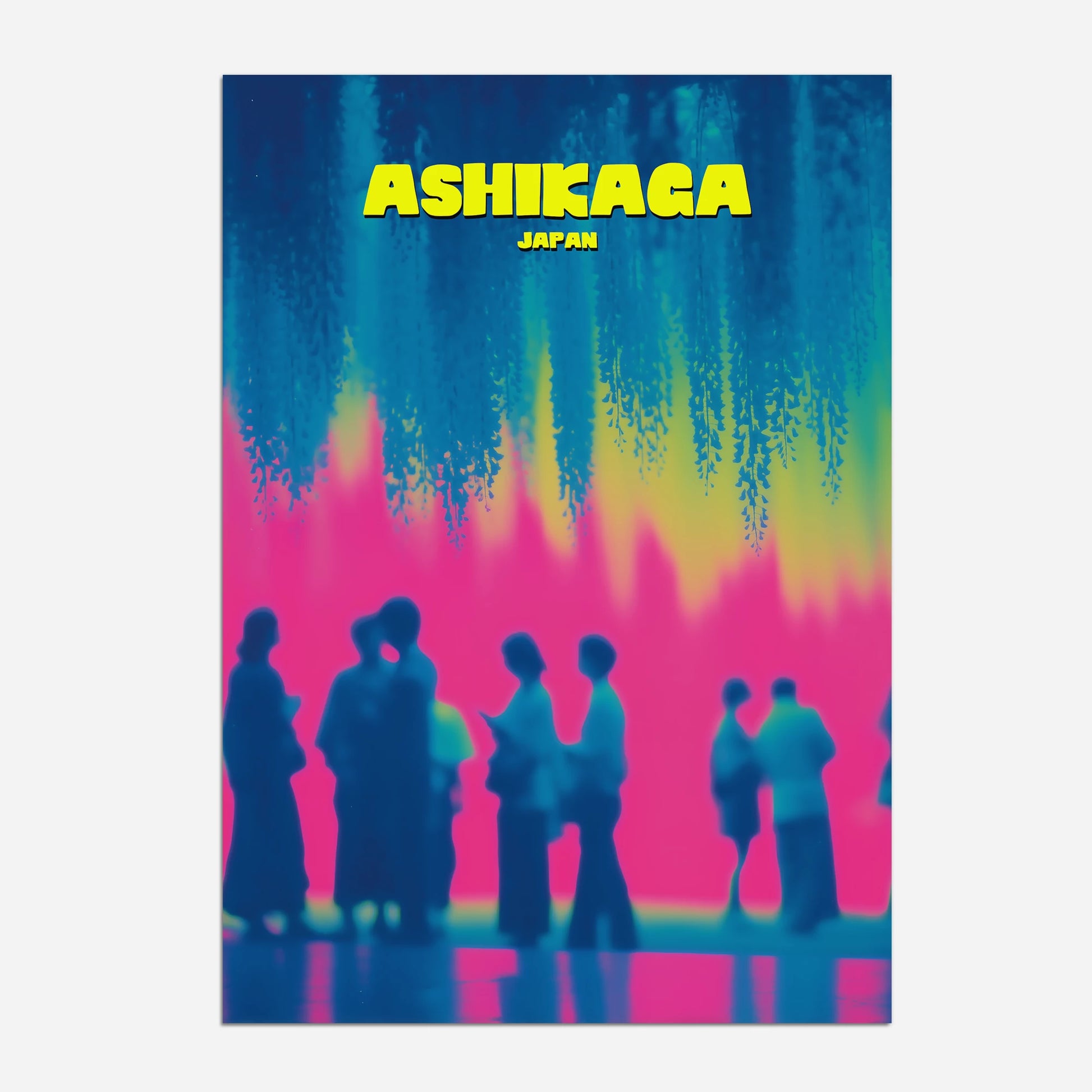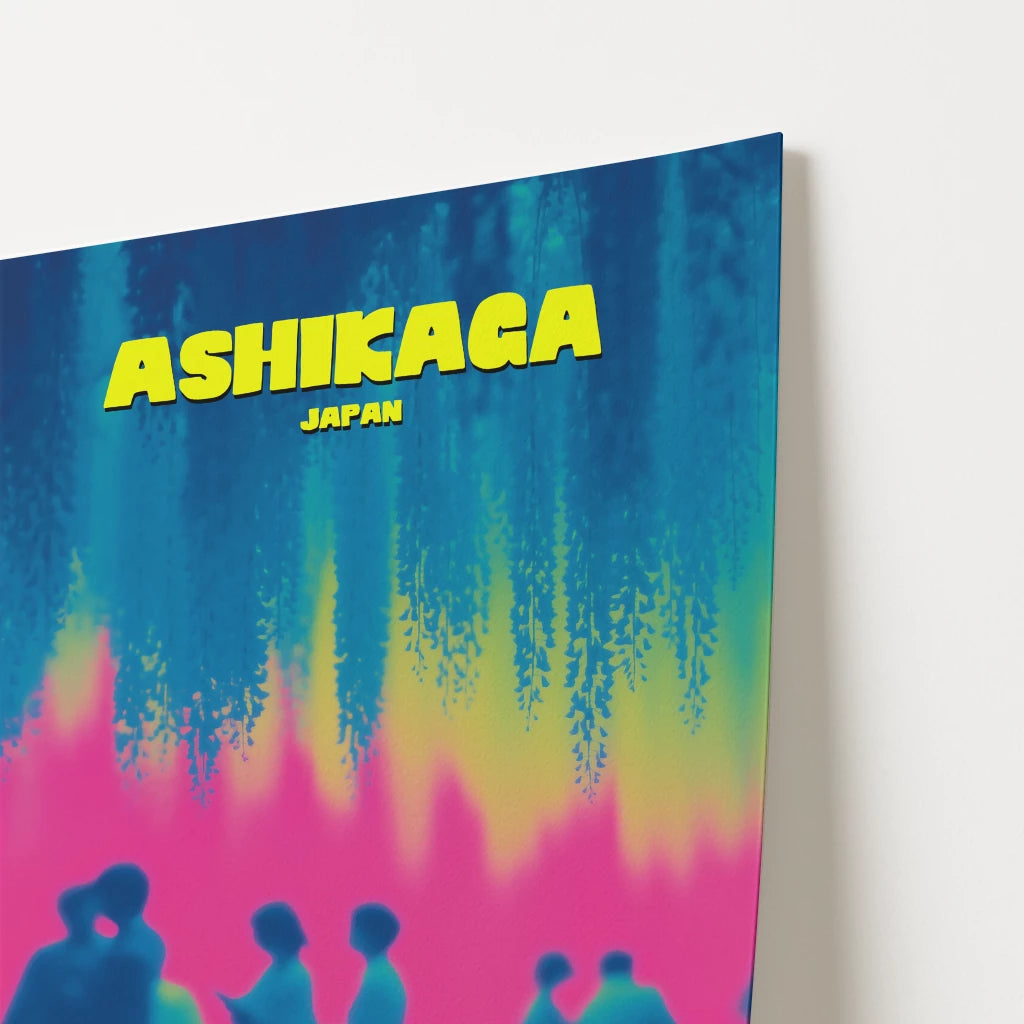 This Ashikaga travel poster captures the charm of visitors gathered under mesmerising hanging wisteria blooms. The bold contrast of hot pink, cool turquoise and sunlit yellow creates a playful and nostalgic feel. Perfect for adding colour and wanderlust to your décor, the design reimagines Japanese culture in a bold, contemporary style. Ideal for art lovers and travellers alike, it’s a statement piece that celebrates tradition with a modern twist.