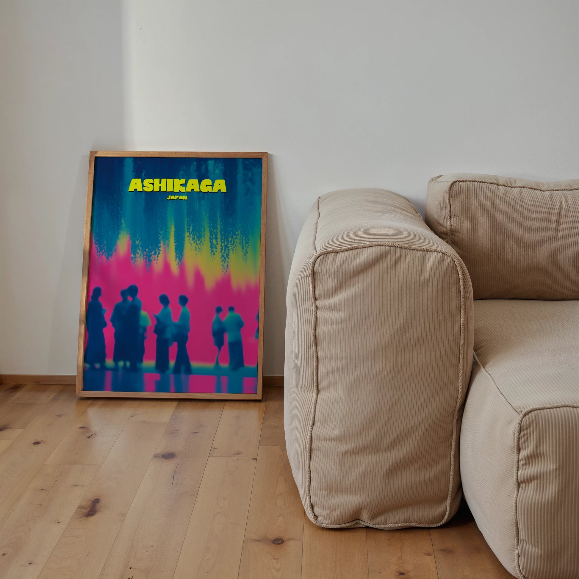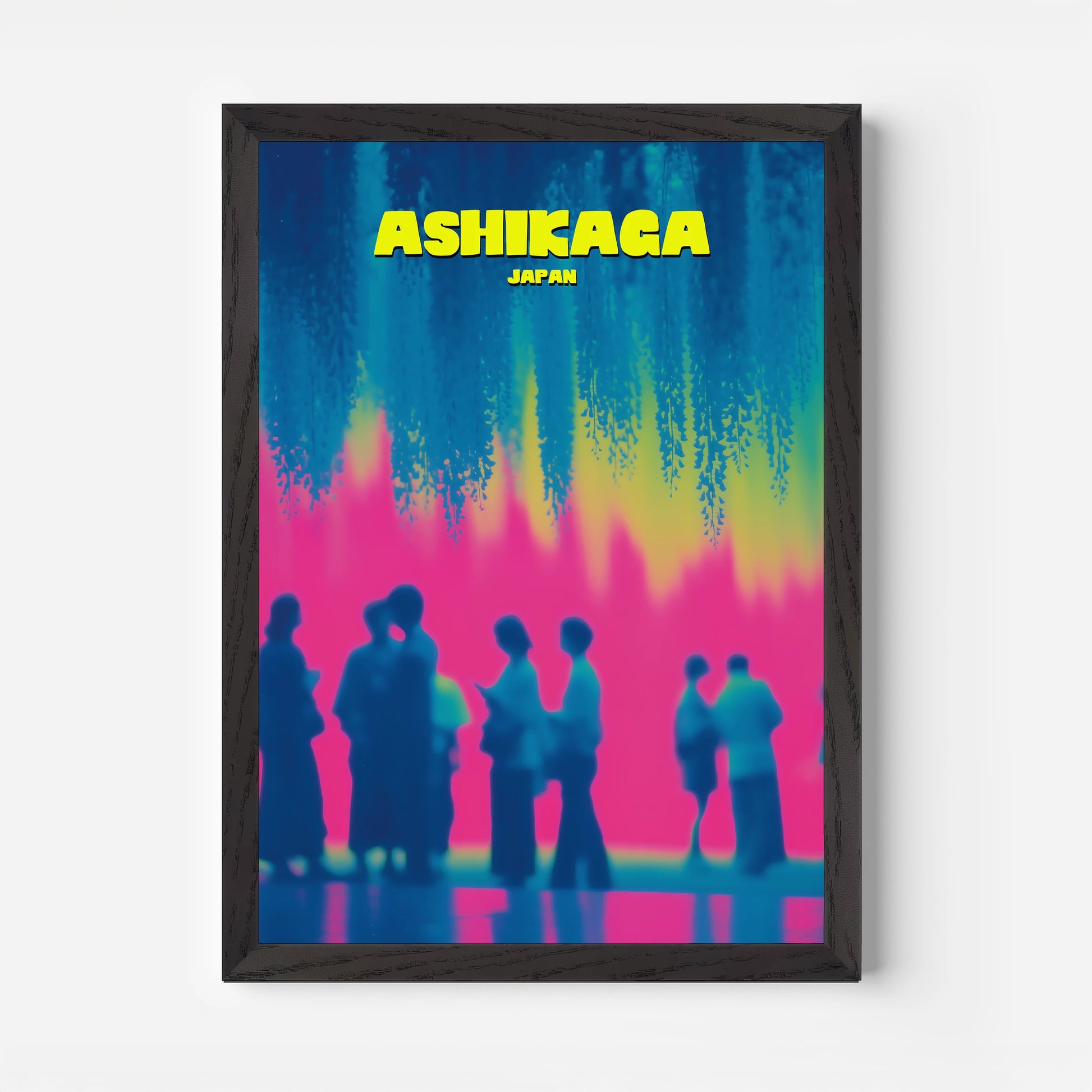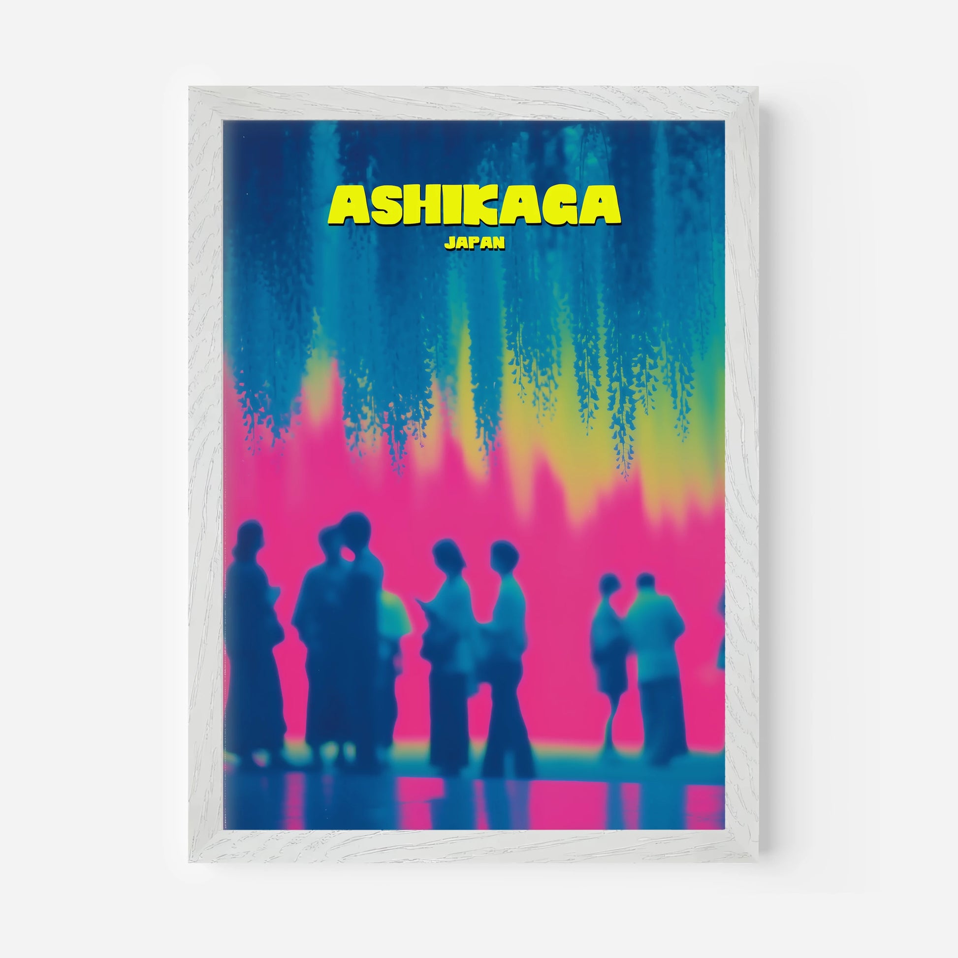This Ashikaga travel poster captures the charm of visitors gathered under mesmerising hanging wisteria blooms. The bold contrast of hot pink, cool turquoise and sunlit yellow creates a playful and nostalgic feel. Perfect for adding colour and wanderlust to your décor, the design reimagines Japanese culture in a bold, contemporary style. Ideal for art lovers and travellers alike, it’s a statement piece that celebrates tradition with a modern twist.