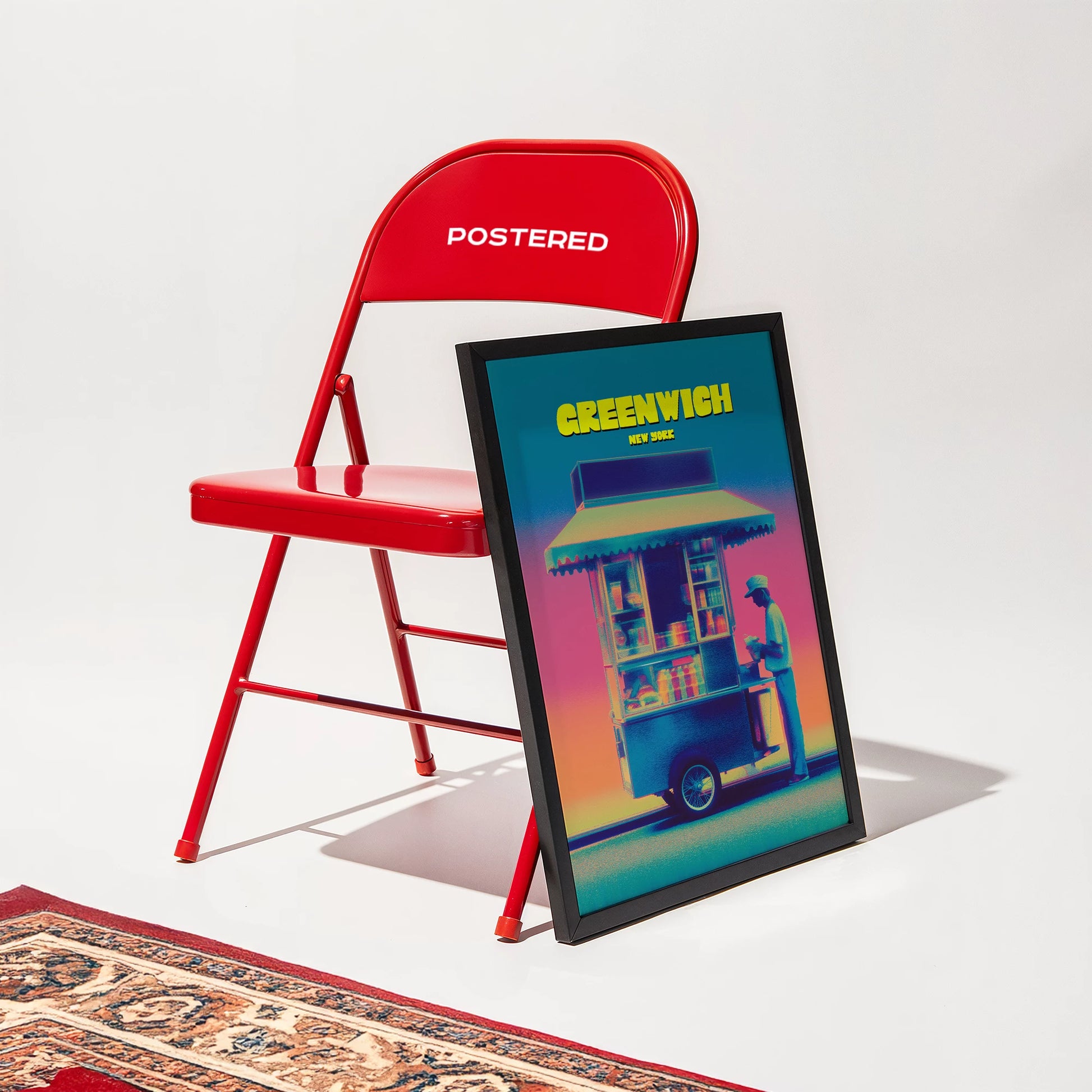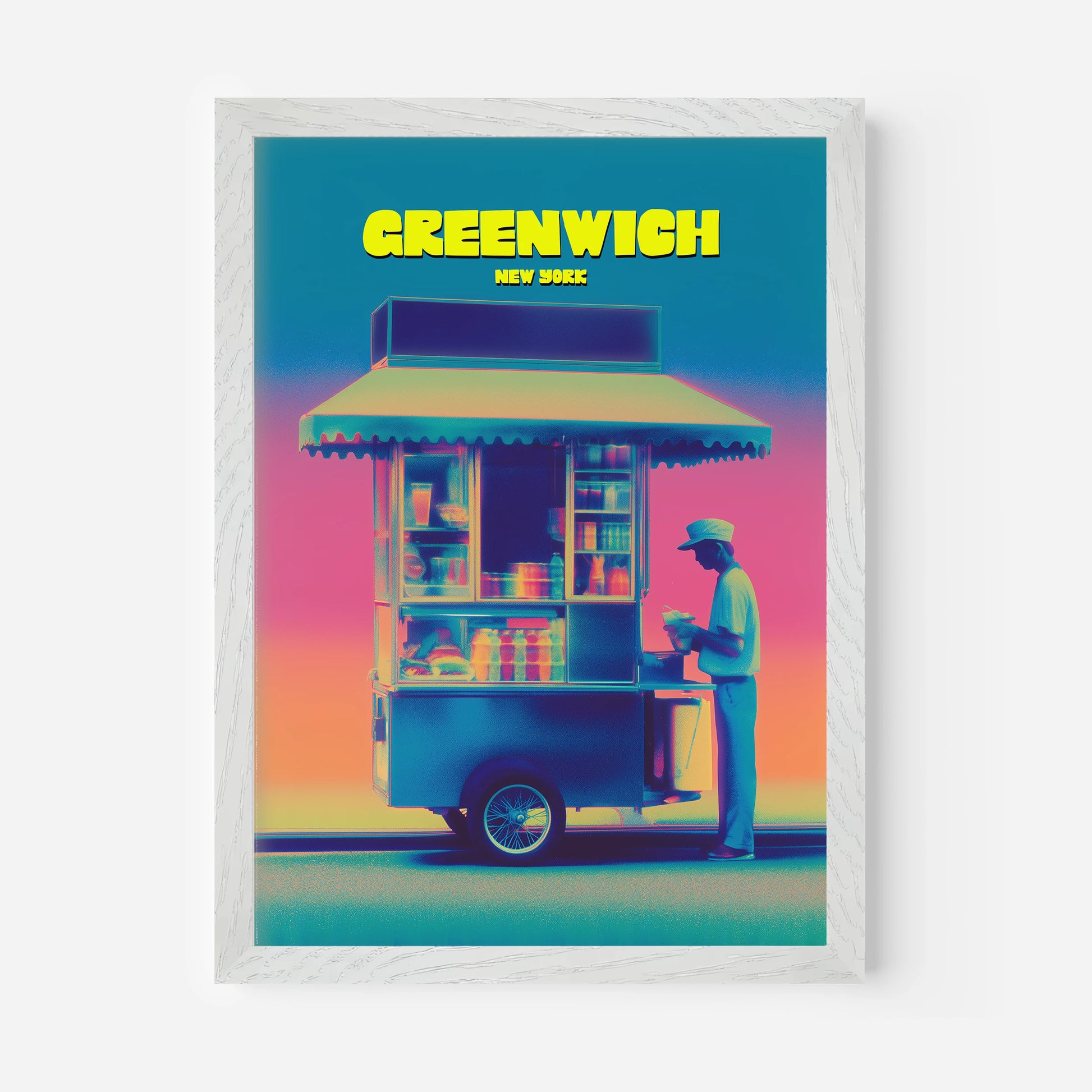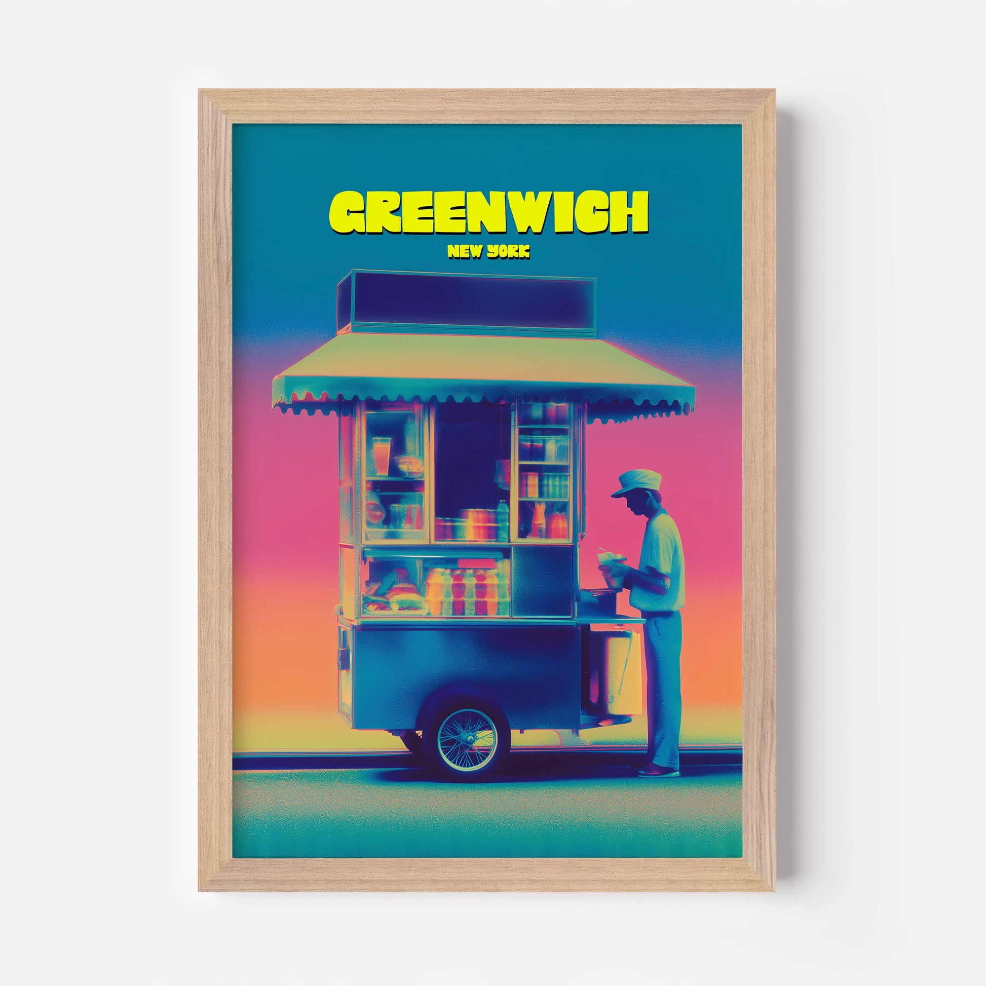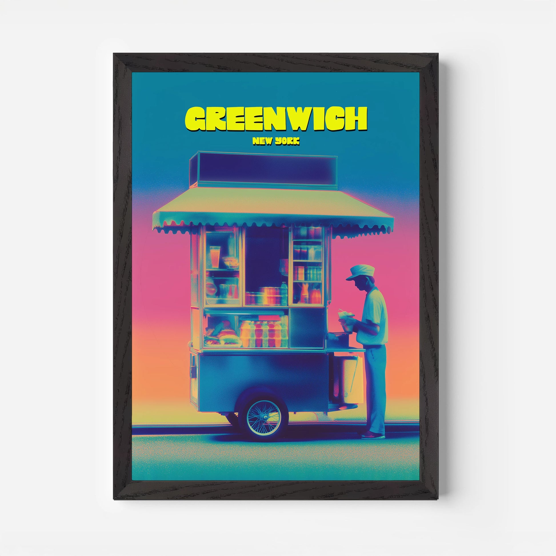 Celebrate the charm of New York street life with this vibrant Greenwich travel poster. Featuring a classic food cart scene bathed in striking neon tones, it captures the city’s unique mix of culture, flavour, and energy. Perfect for fans of urban photography, retro art, and bold interiors, this print adds a splash of colour and nostalgia to any wall. Printed on premium quality paper, this Greenwich travel poster is a stylish tribute to one of the world’s most iconic neighbourhoods.
