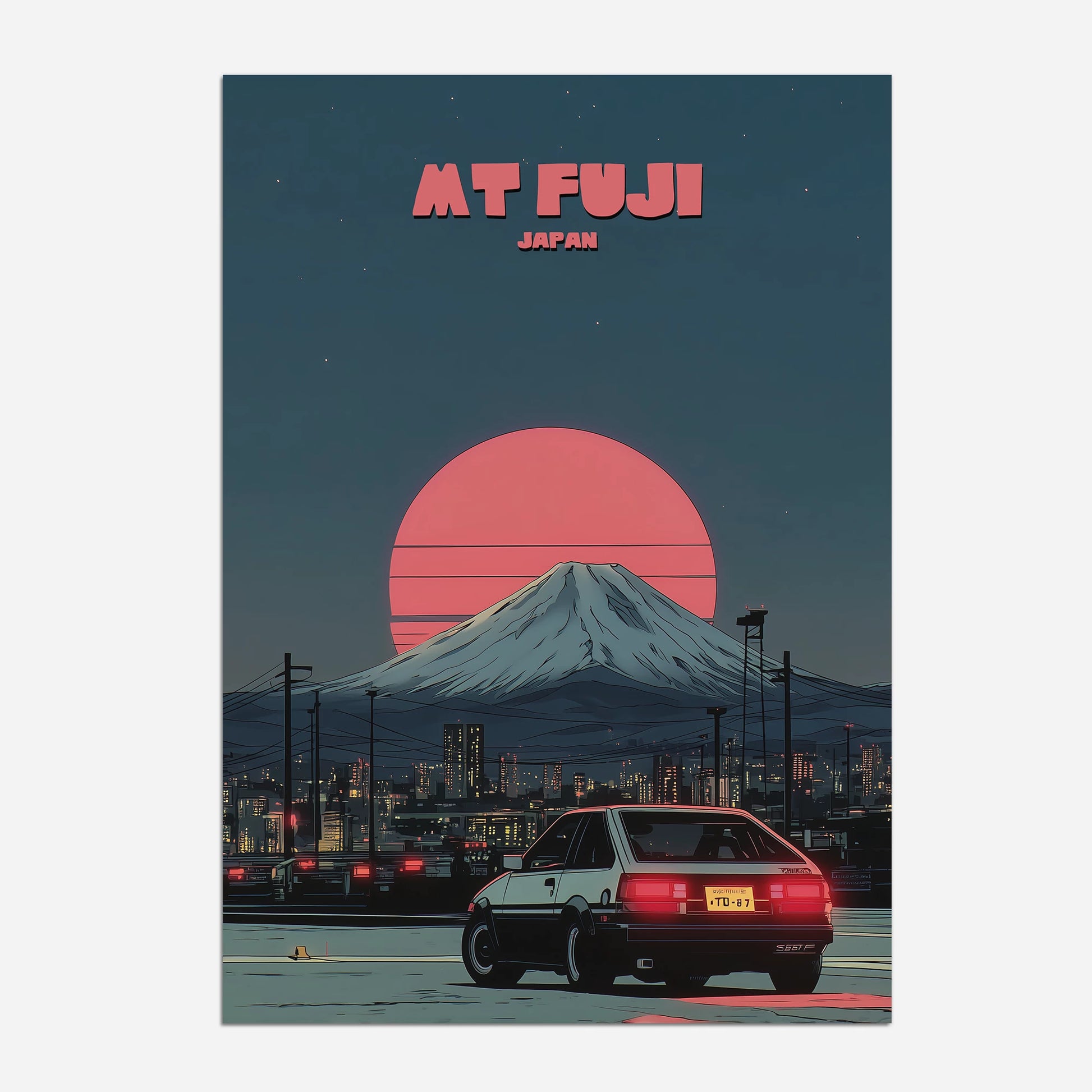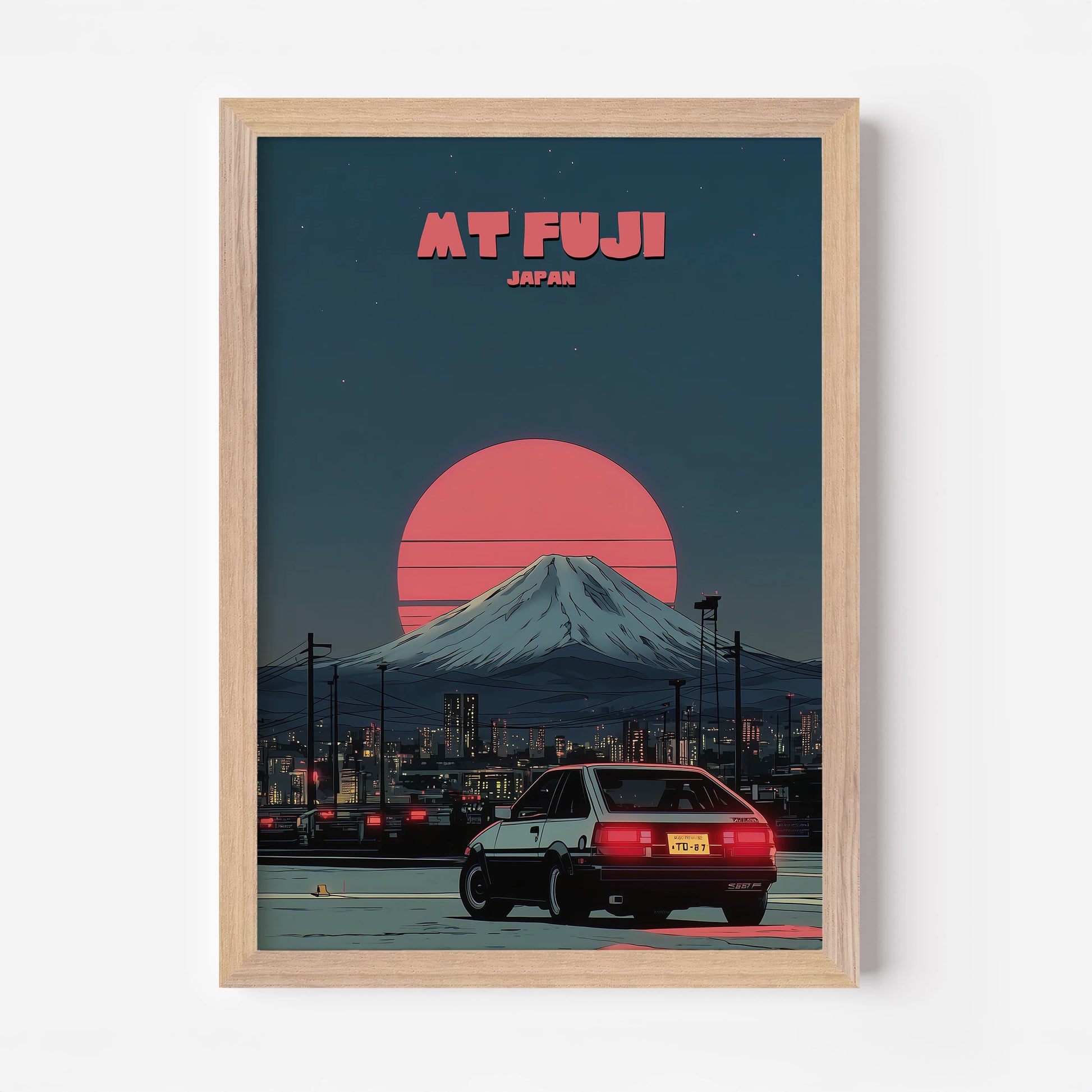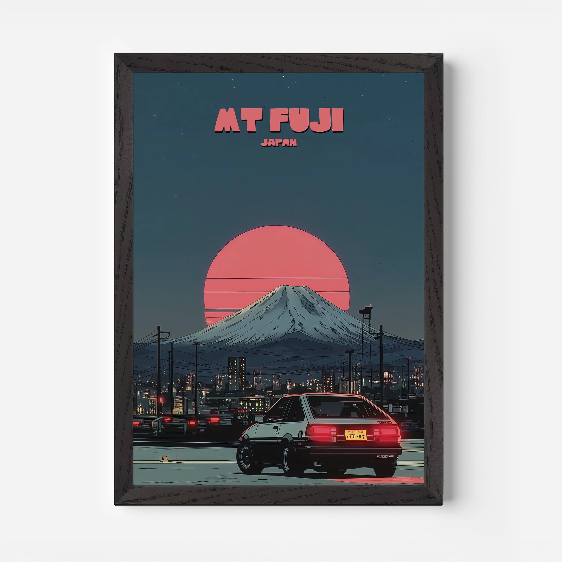 Bring a touch of Japanese style and retro charm to your walls with this striking Mt Fuji travel poster. Featuring the iconic snow-capped peak at sunset, framed by a glowing red sun and the twinkling lights of the city, the design blends nature’s beauty with urban energy. The foreground showcases a classic car, adding a nostalgic, cinematic feel. Ideal for lovers of Japanese culture, cityscapes, and vintage-inspired art, this Mt Fuji travel poster is a bold statement piece for any home or office.