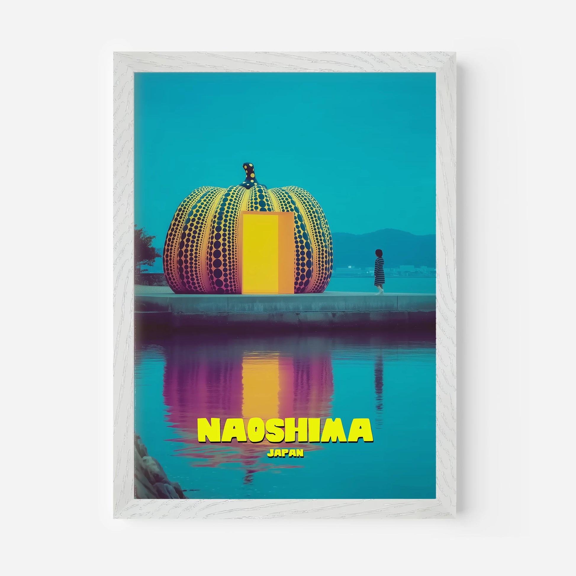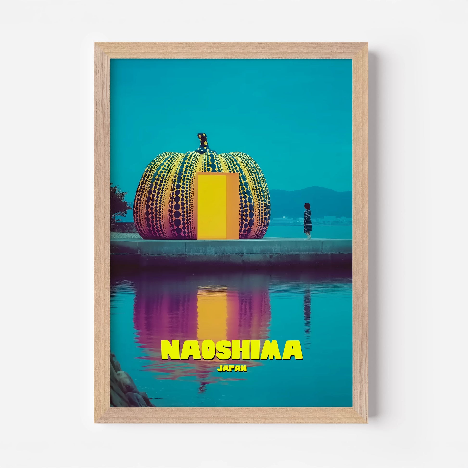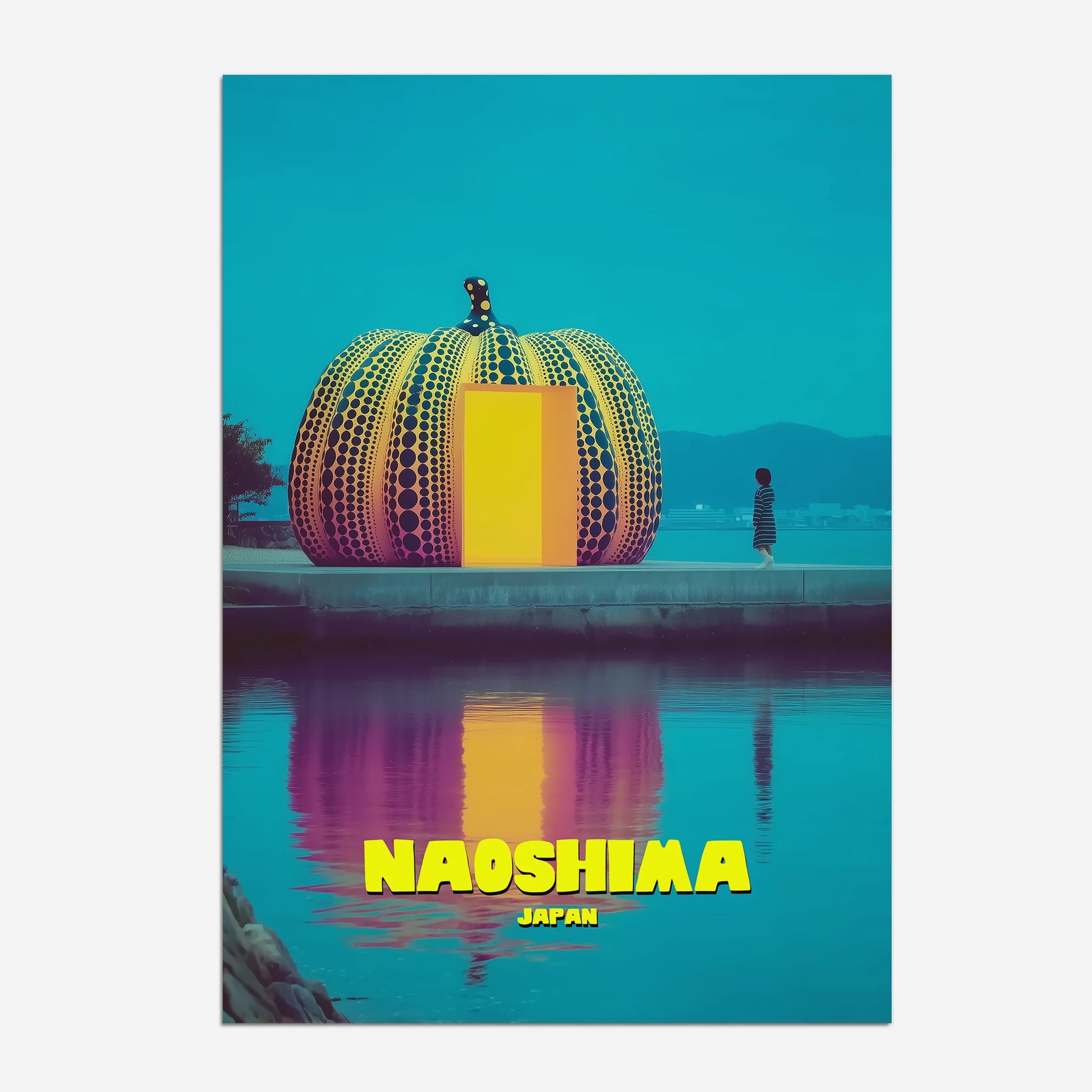 Celebrate Japan’s “art island” with this Naoshima travel poster, featuring Yayoi Kusama’s iconic pumpkin sculpture. The vibrant design uses bright yellow, bold orange and deep turquoise, with reflections glowing across the water. A fusion of contemporary art and travel nostalgia, this poster is perfect for modern interiors. A must-have for fans of Japanese design, bold colours and unique cultural landmarks.