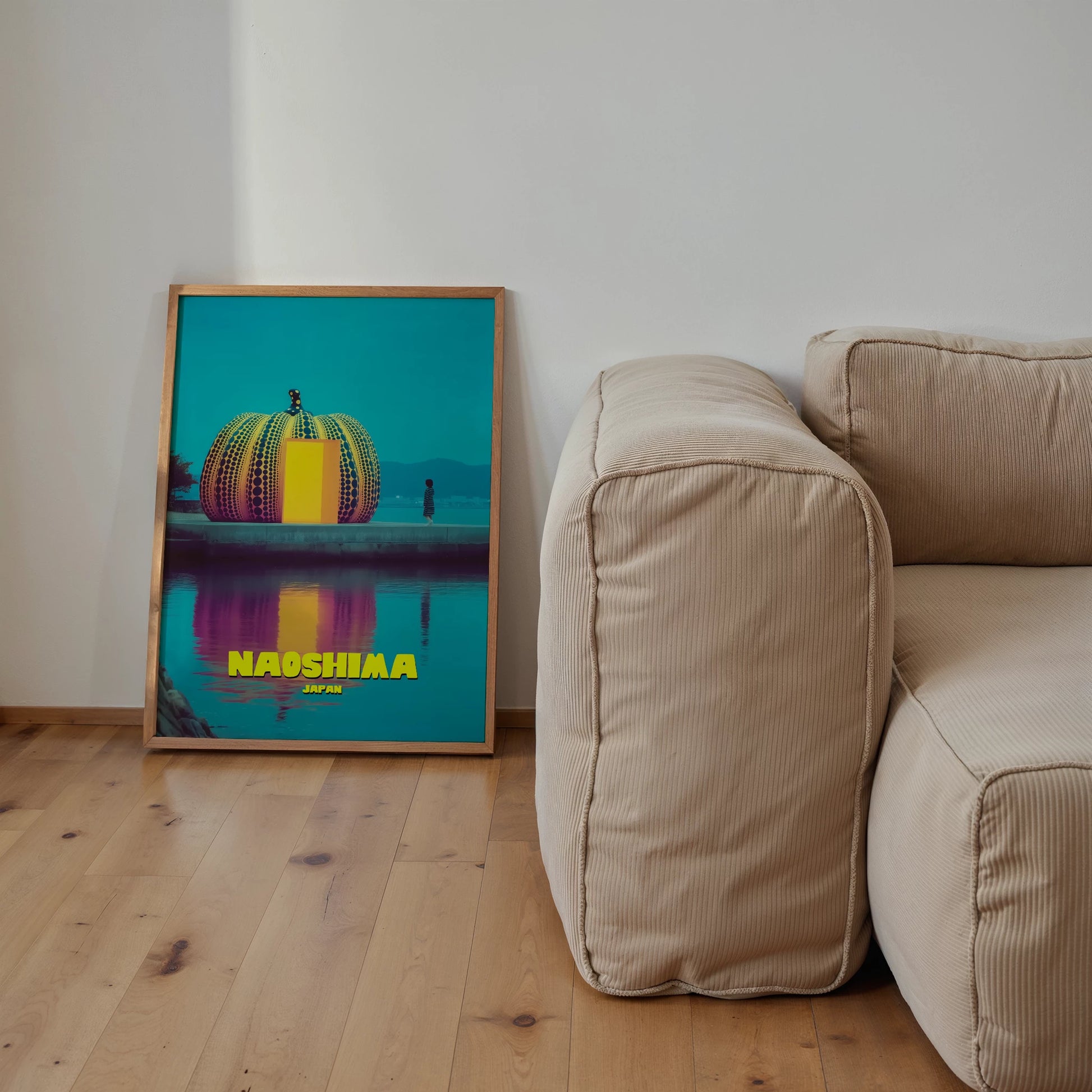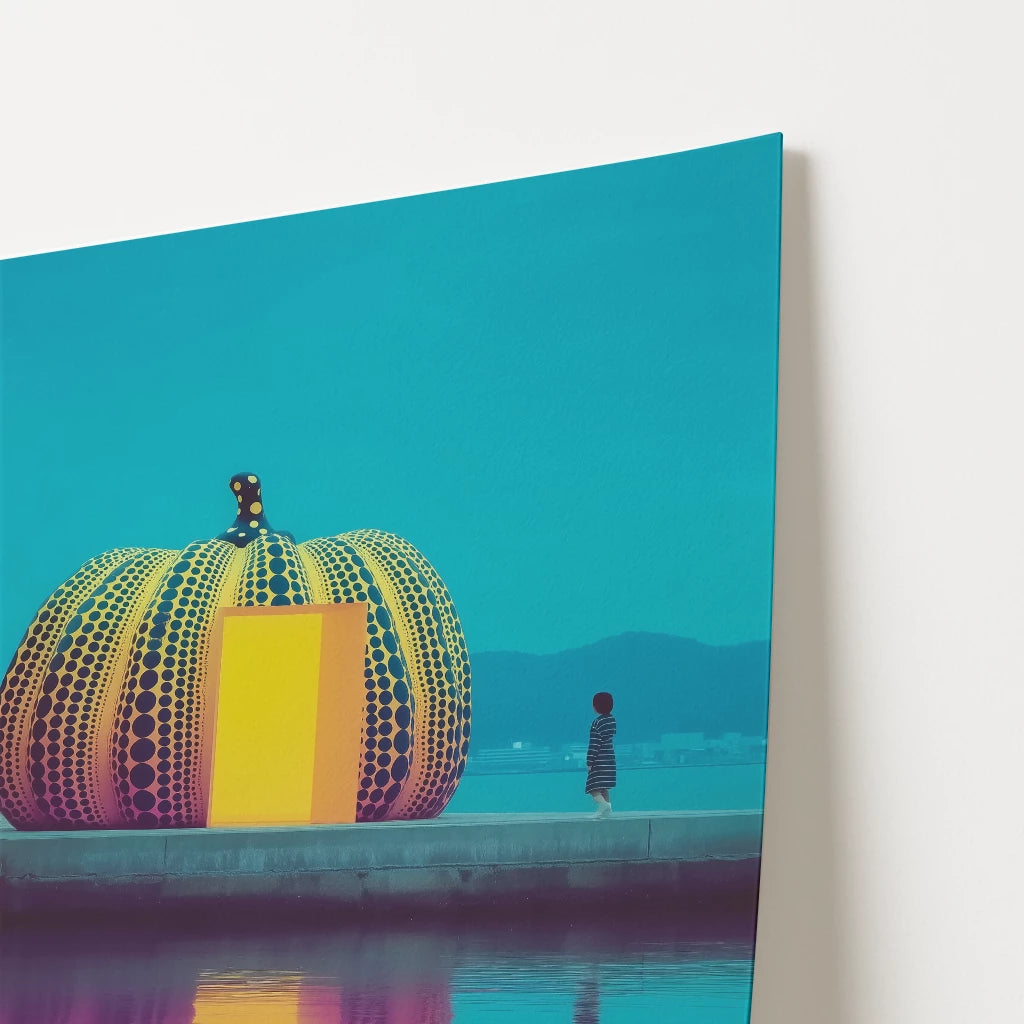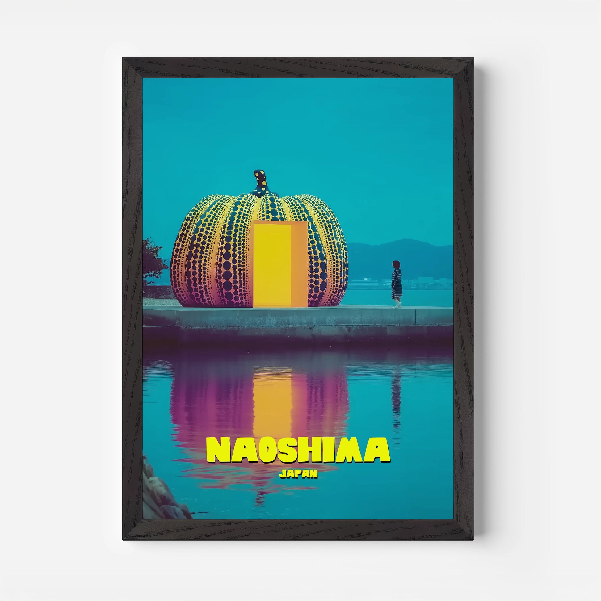 Celebrate Japan’s “art island” with this Naoshima travel poster, featuring Yayoi Kusama’s iconic pumpkin sculpture. The vibrant design uses bright yellow, bold orange and deep turquoise, with reflections glowing across the water. A fusion of contemporary art and travel nostalgia, this poster is perfect for modern interiors. A must-have for fans of Japanese design, bold colours and unique cultural landmarks.