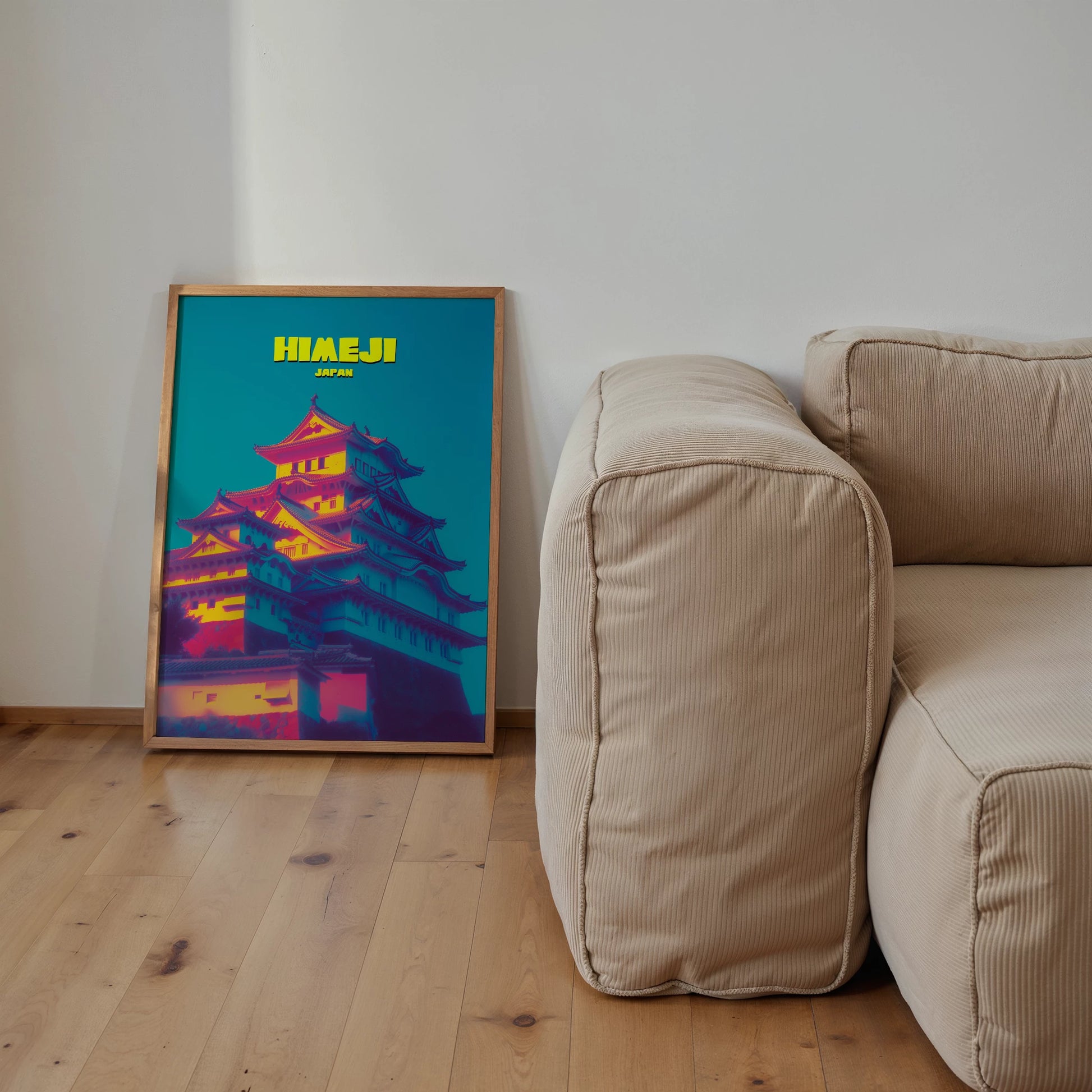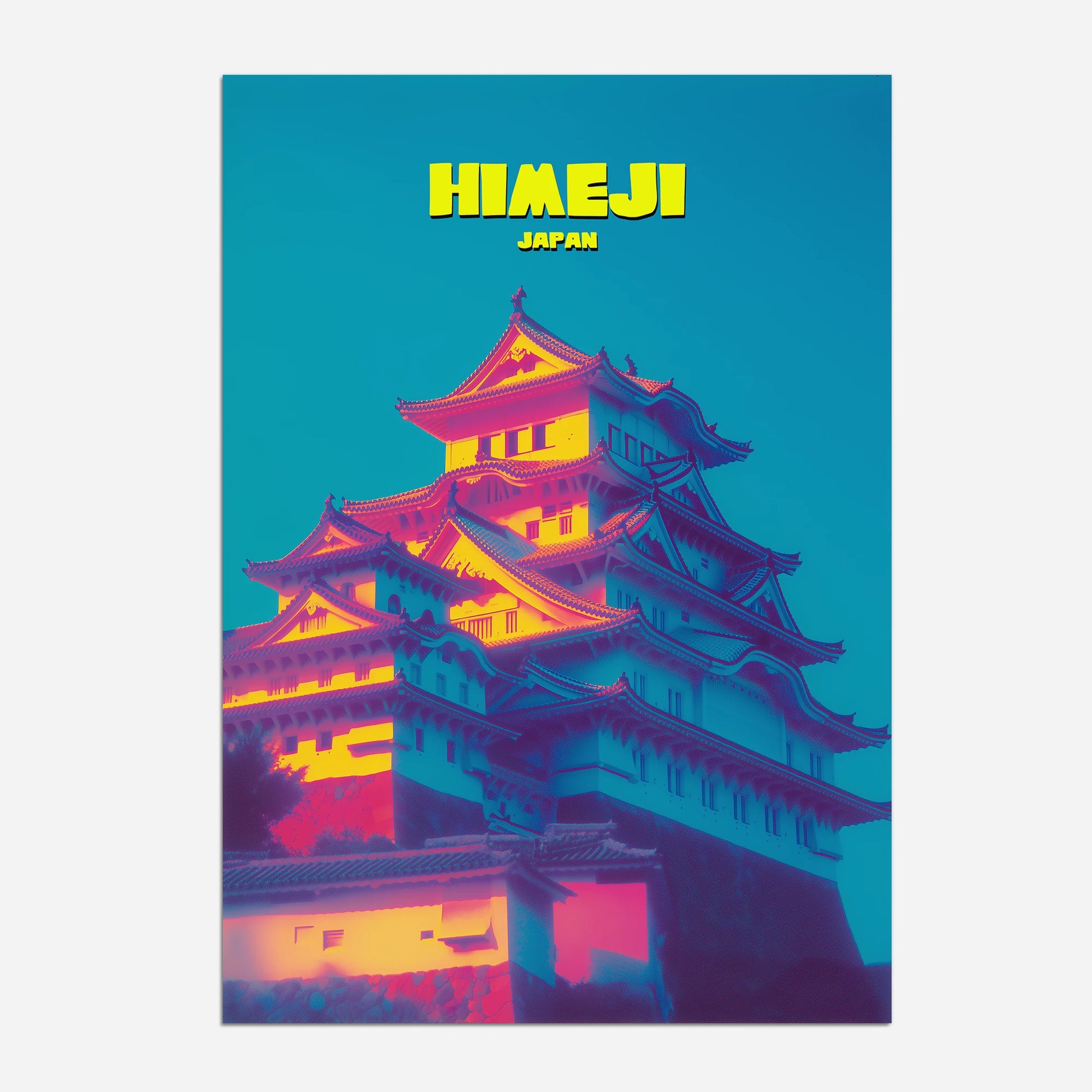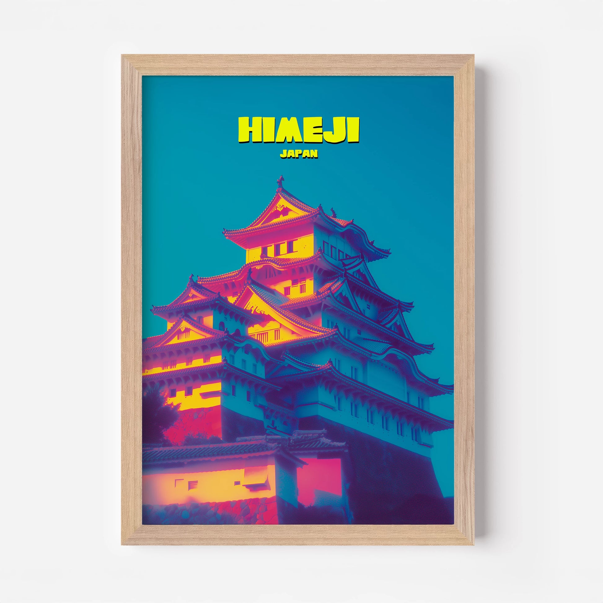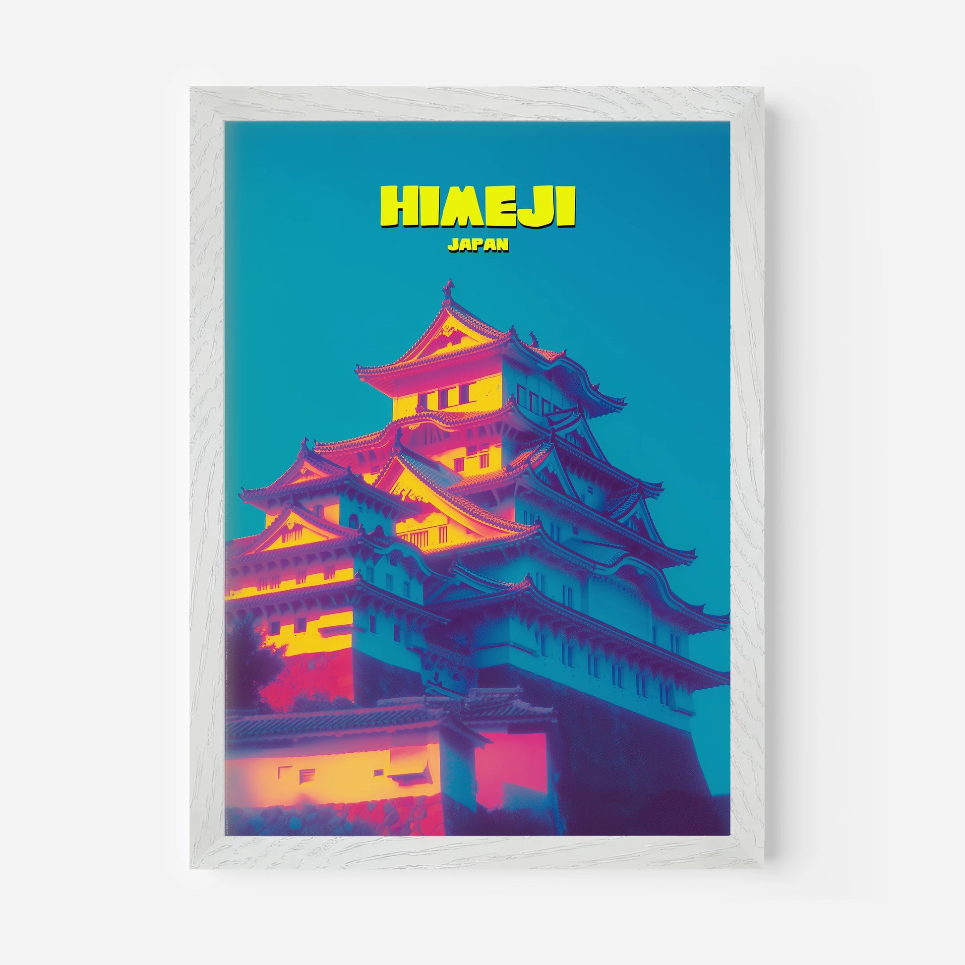 This Himeji Castle travel poster highlights the fortress in glowing tones of pink, yellow and indigo. The striking colour palette transforms the historic landmark into a modern art piece, making it ideal for adding drama to your home décor. A unique way to celebrate Japanese culture, this print combines heritage with bold contemporary design. Perfect for travellers, art lovers and anyone who wants an eye-catching centrepiece.