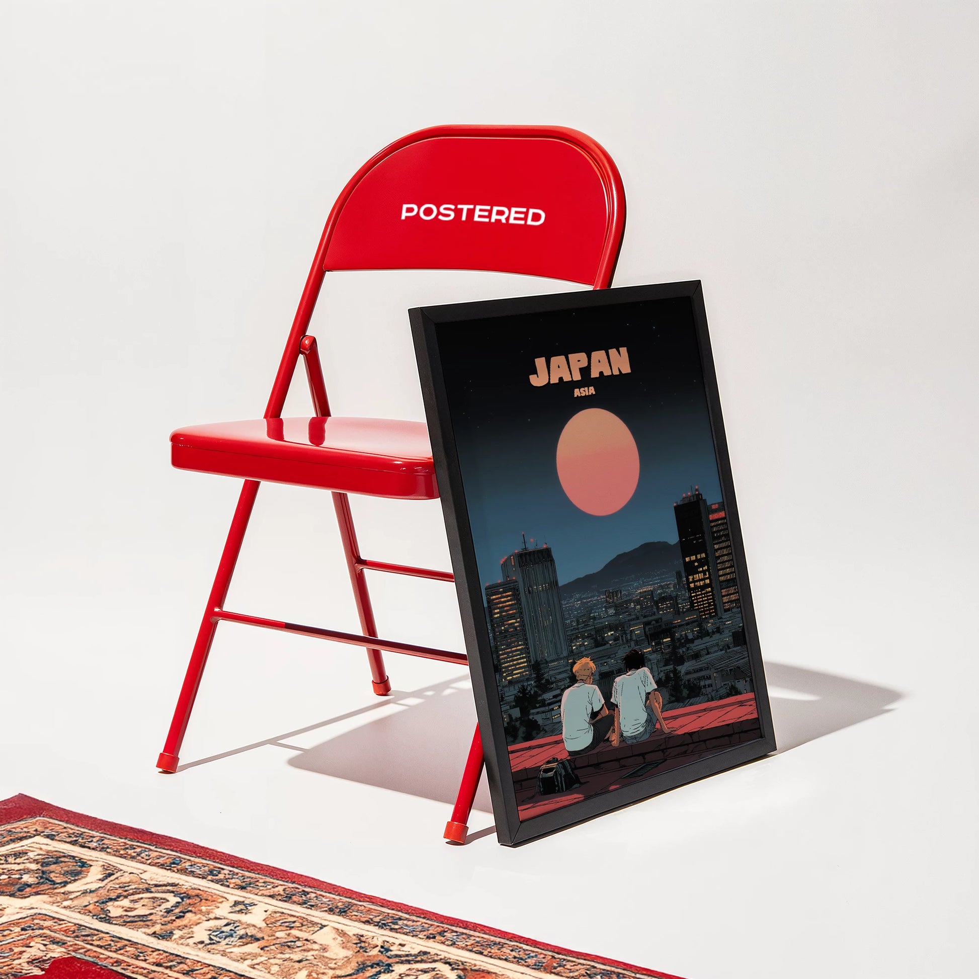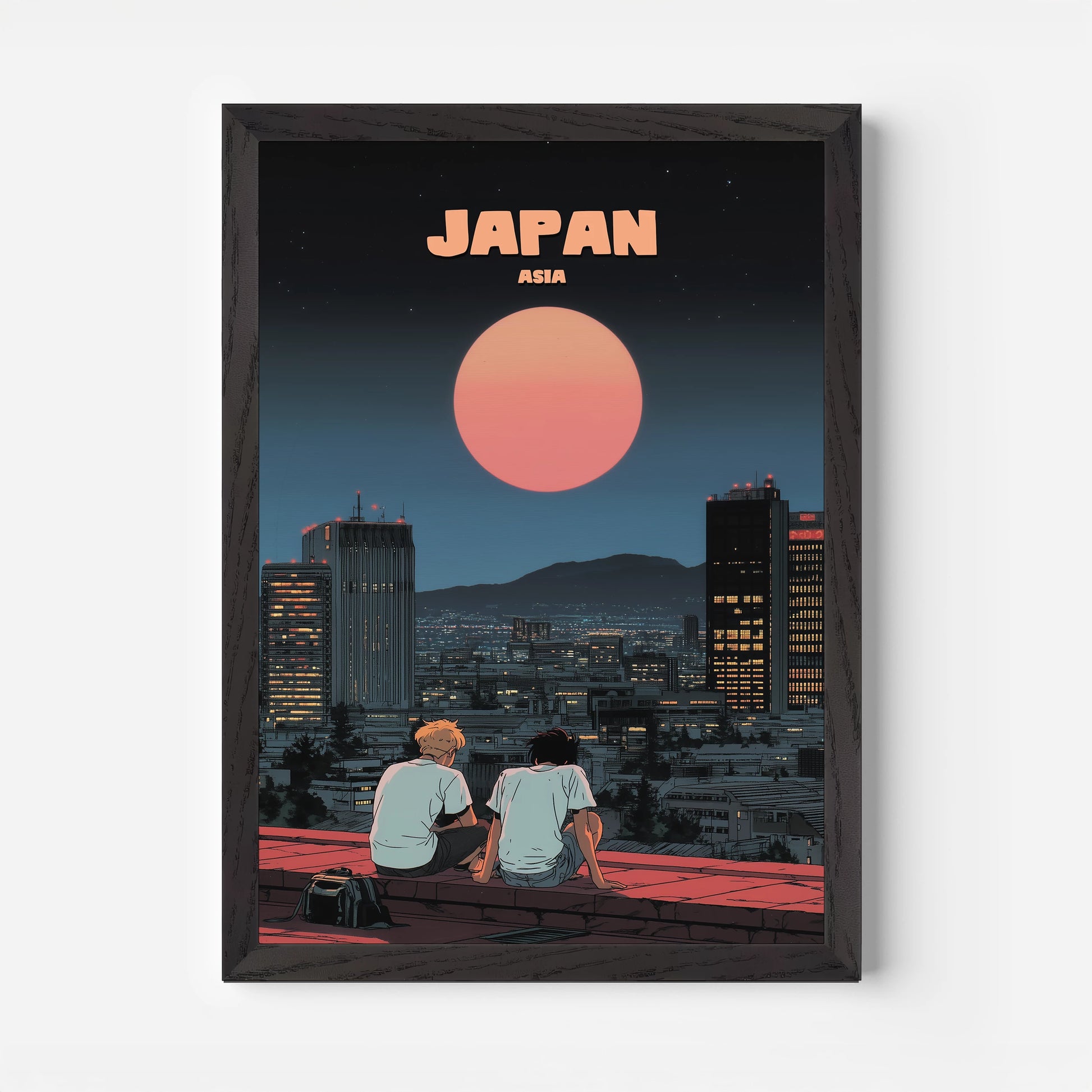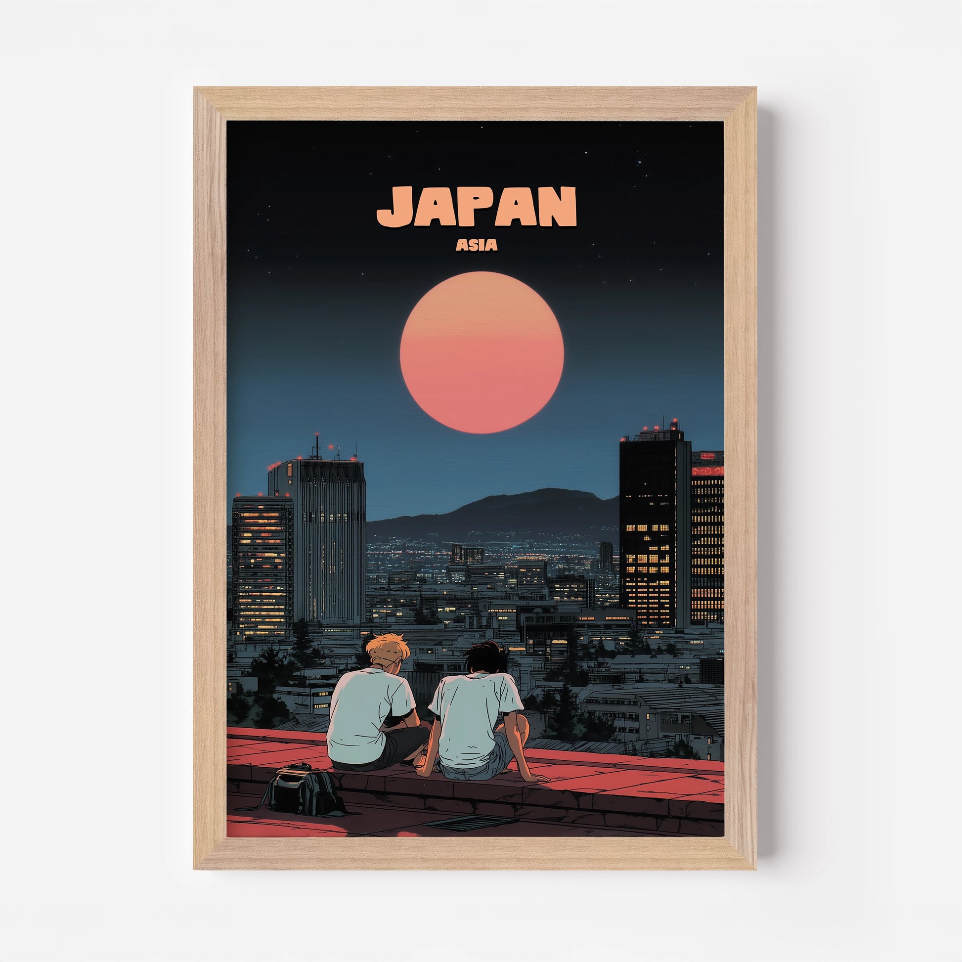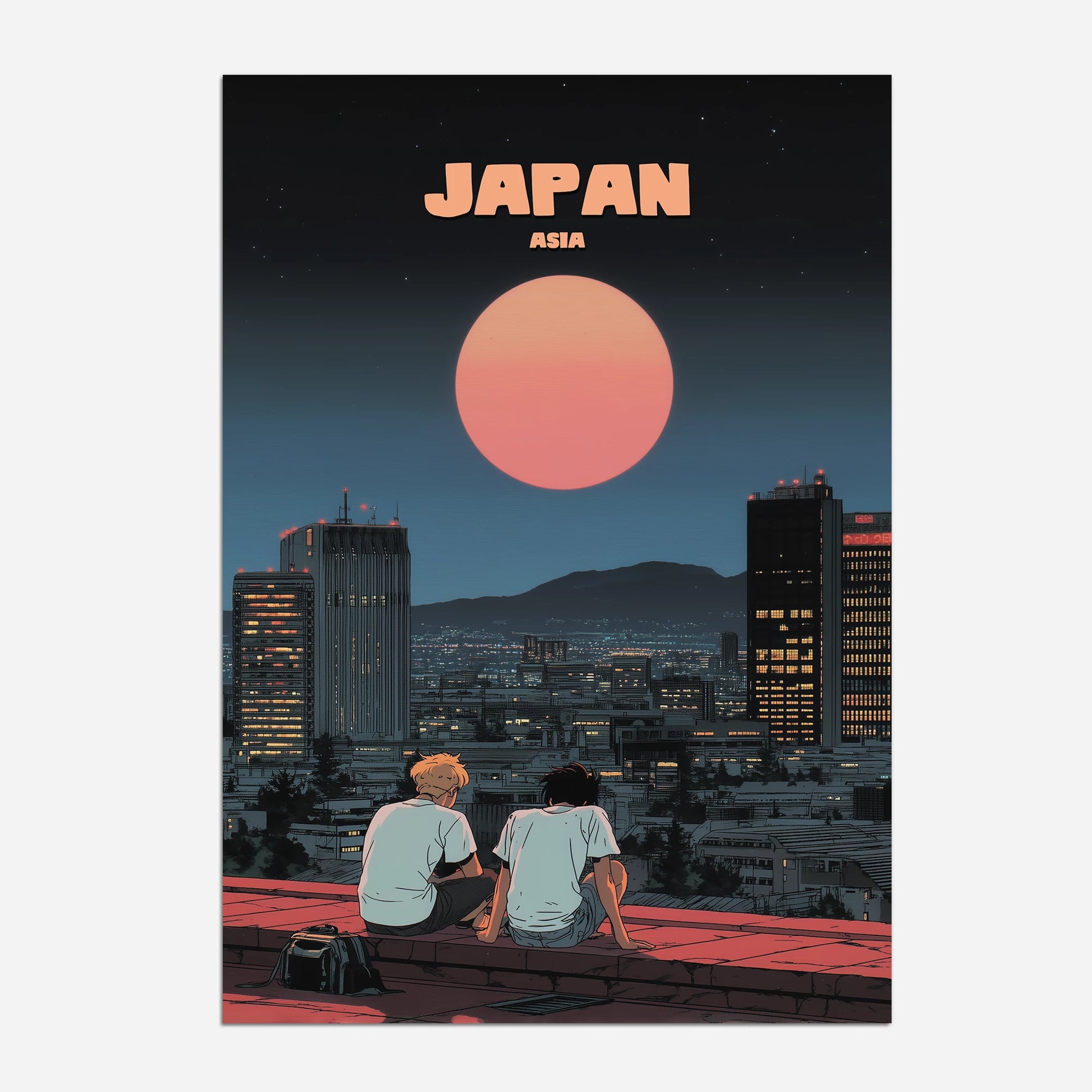 Capture the magic of Japan’s city nights with this beautifully illustrated travel poster. Featuring two friends gazing at a glowing red moon above a sparkling urban skyline, it blends modern city life with a dreamy, cinematic charm. Perfect for lovers of Japanese culture, anime-inspired art, and atmospheric design, this print adds depth and wanderlust to any space. Whether you’ve strolled Tokyo’s streets or dream of visiting, this Japan travel poster is a striking way to bring the Land of the Rising Sun into your home.