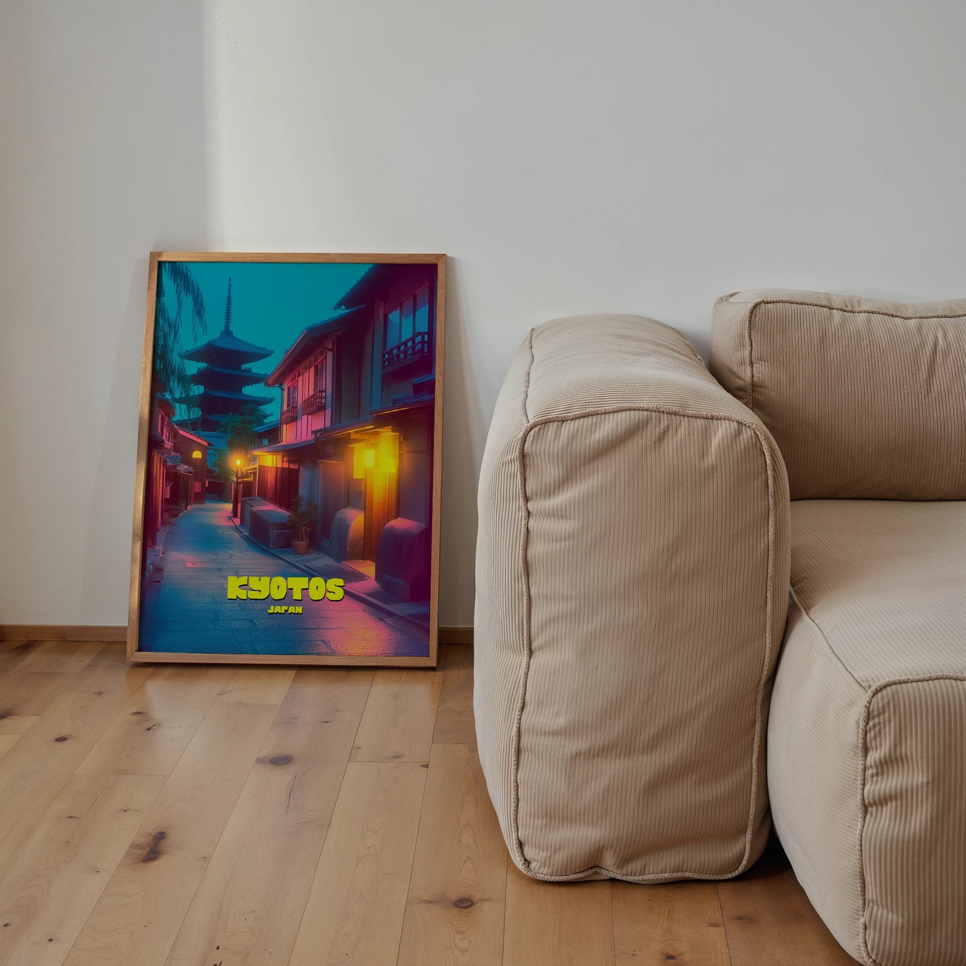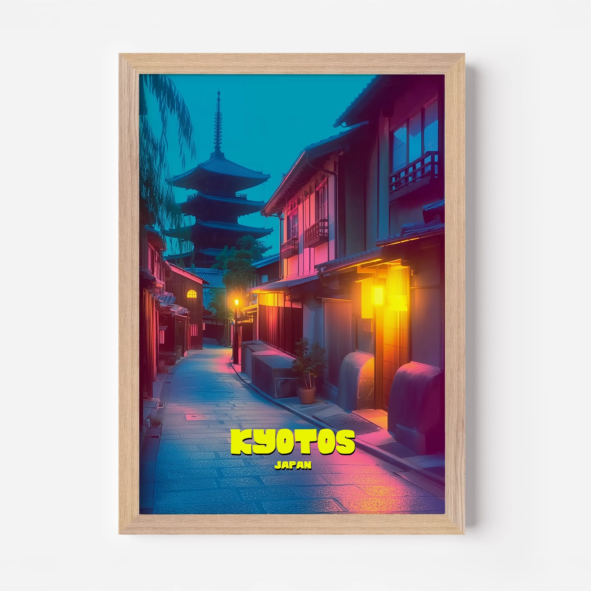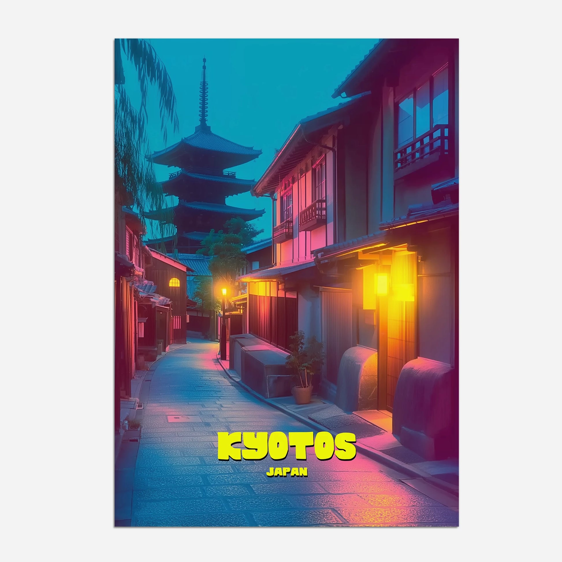 Step back in time with this atmospheric Kyoto travel poster. Depicting a peaceful machiya street lit by warm yellow lanterns, the scene glows against cool blue and purple tones, with a temple pagoda rising in the background. The neon-inspired palette brings a modern twist to a traditional setting. Ideal for travel enthusiasts and lovers of Japanese culture. A timeless piece printed with outstanding clarity and colour vibrancy.