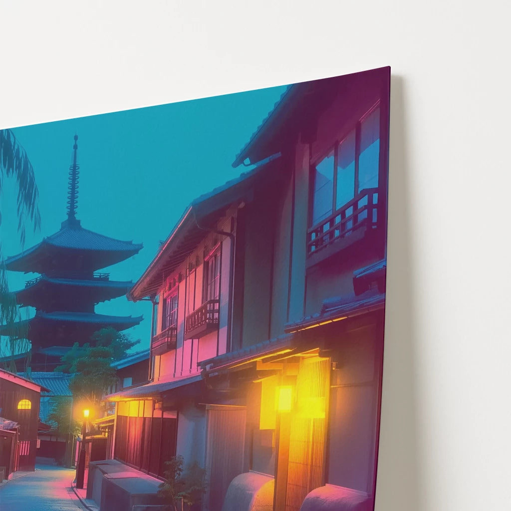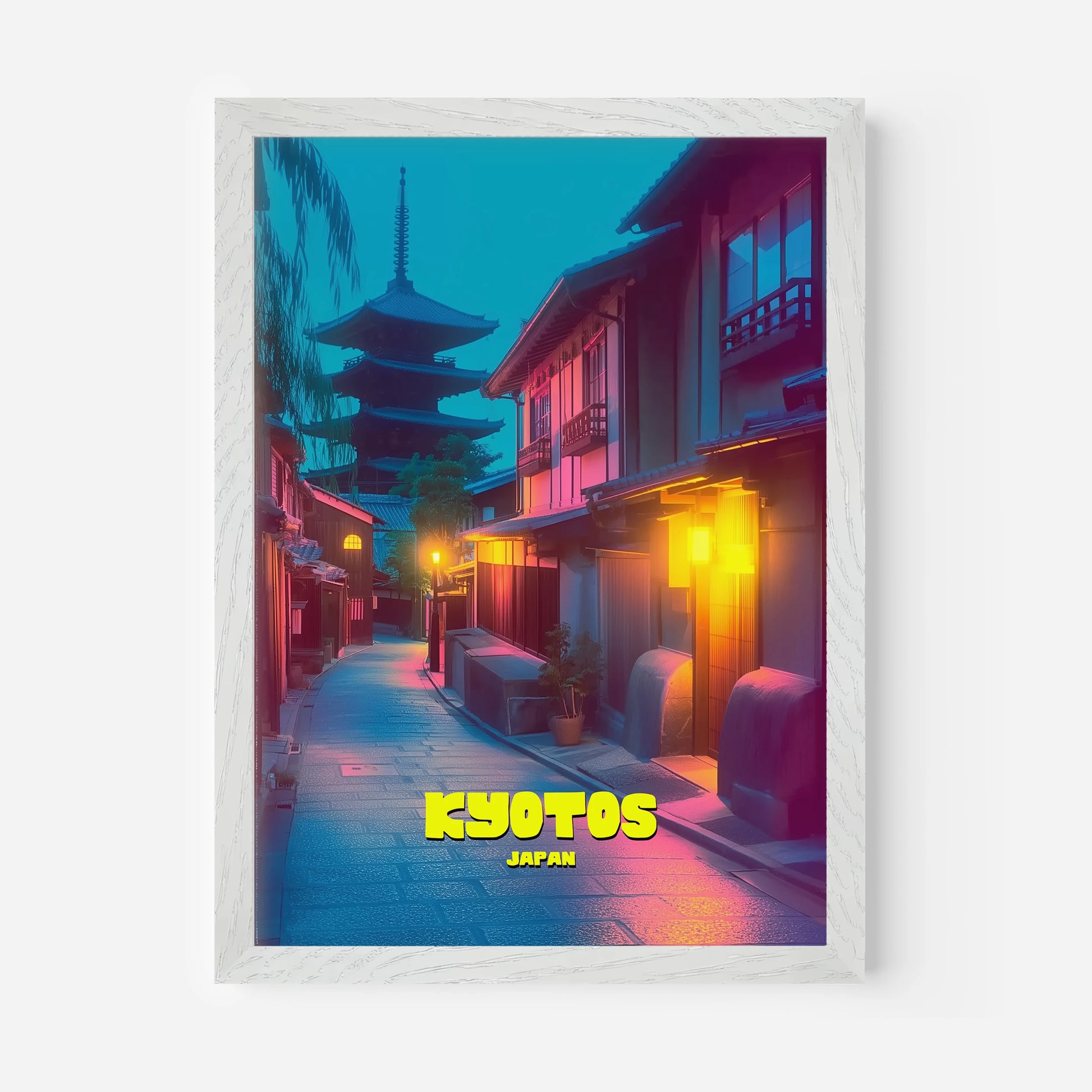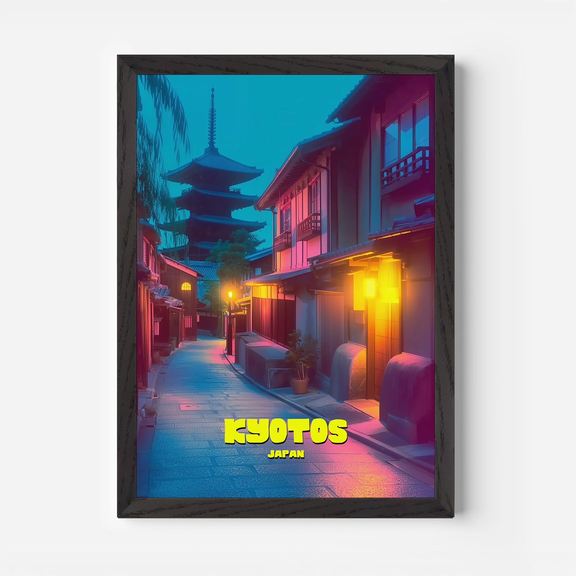 Step back in time with this atmospheric Kyoto travel poster. Depicting a peaceful machiya street lit by warm yellow lanterns, the scene glows against cool blue and purple tones, with a temple pagoda rising in the background. The neon-inspired palette brings a modern twist to a traditional setting. Ideal for travel enthusiasts and lovers of Japanese culture. A timeless piece printed with outstanding clarity and colour vibrancy.