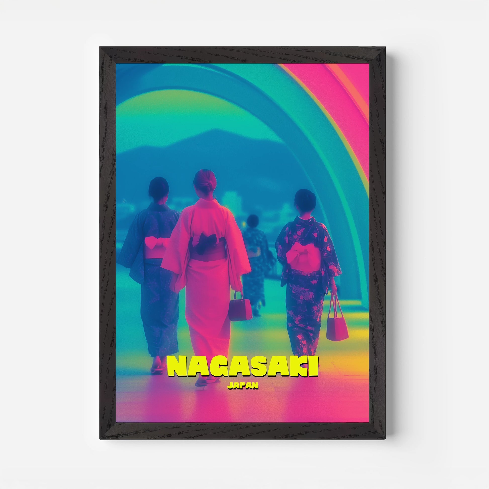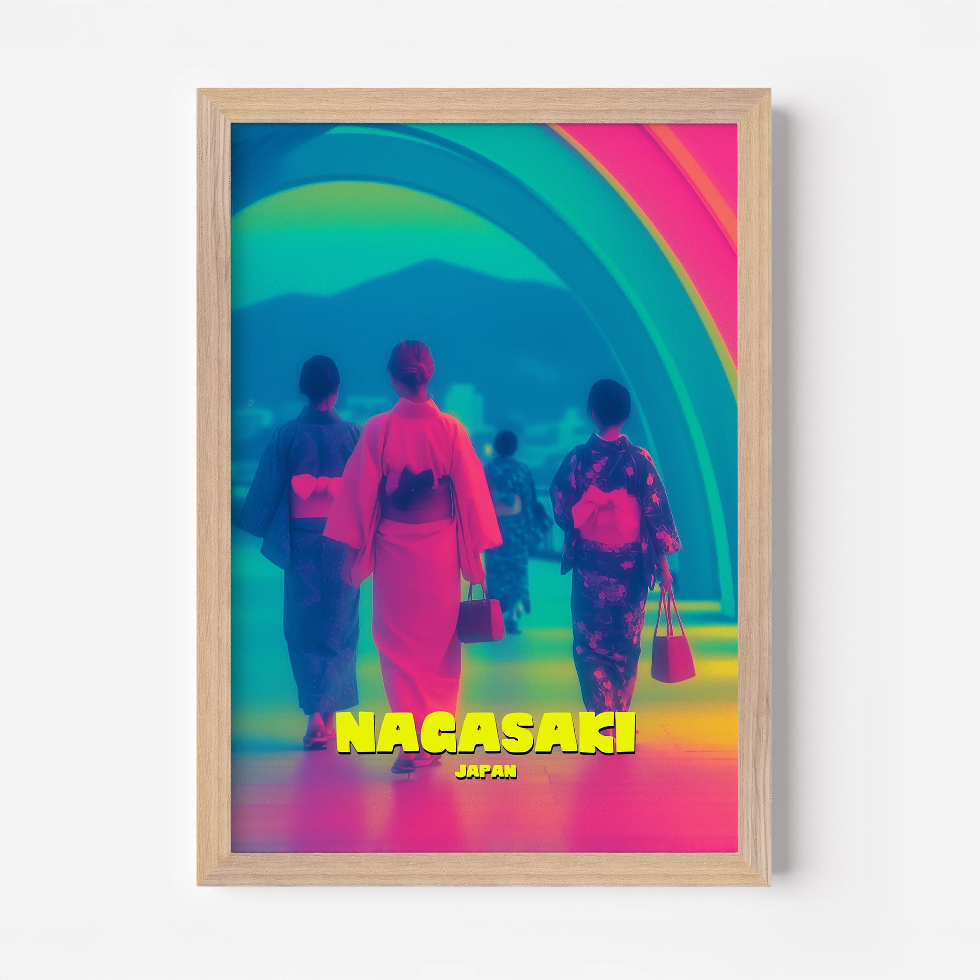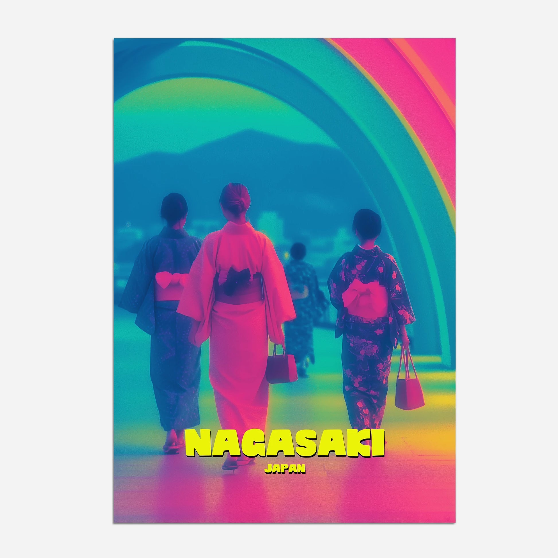 Celebrate tradition and modernity with this Nagasaki travel poster. Featuring women in colourful kimonos walking beneath a glowing rainbow arch, this design blends cultural richness with bold neon-inspired tones of pink, blue, and yellow. The striking mix of colours makes it a captivating focal point for any room. Perfect for collectors of travel art and lovers of Japanese culture. Professionally printed with exceptional detail.
