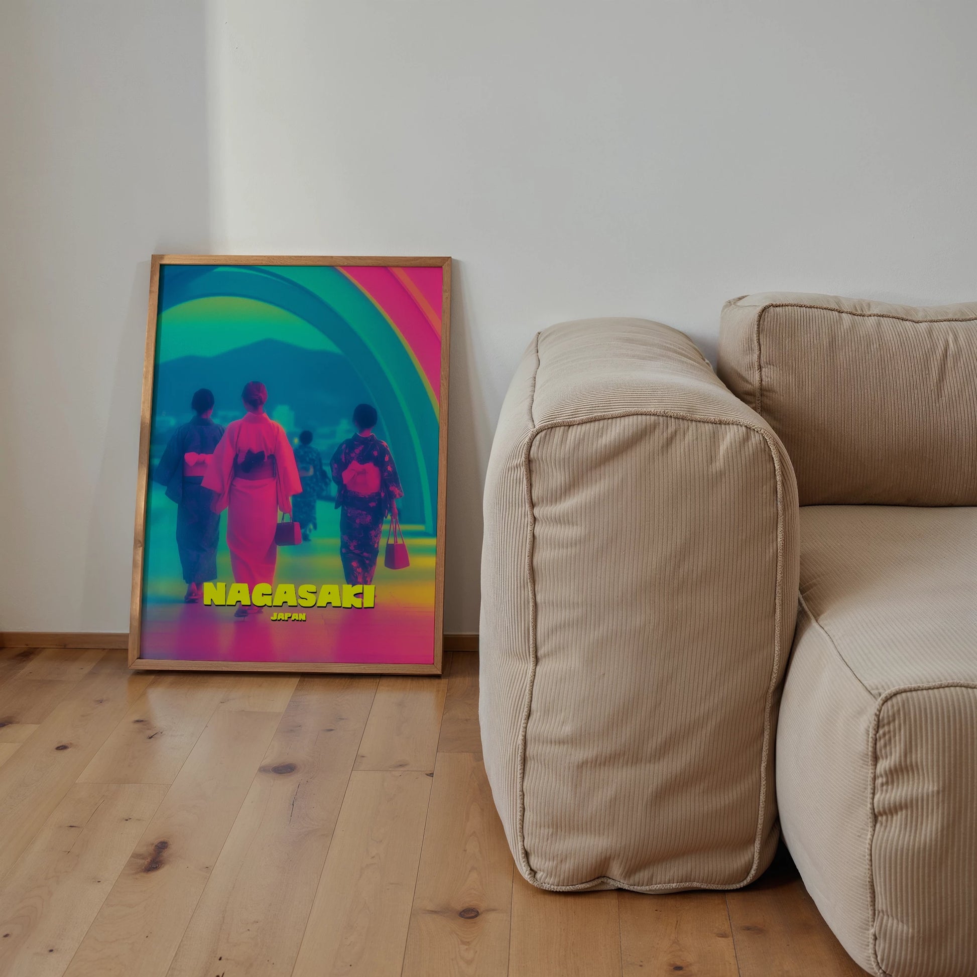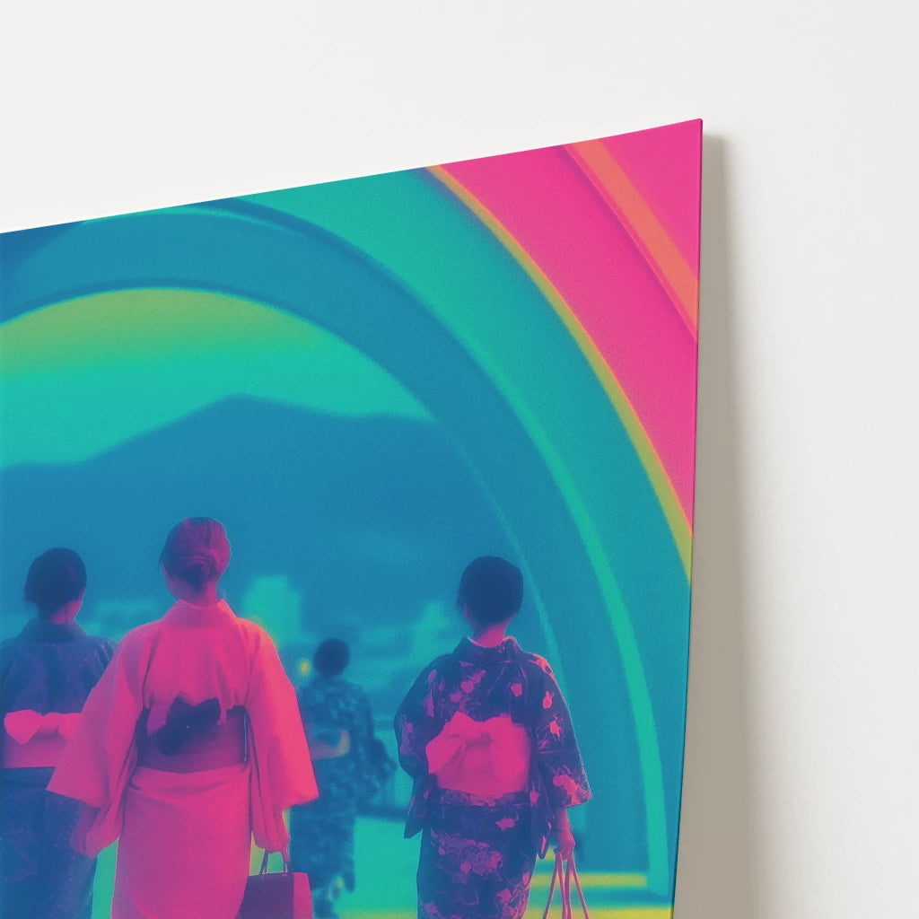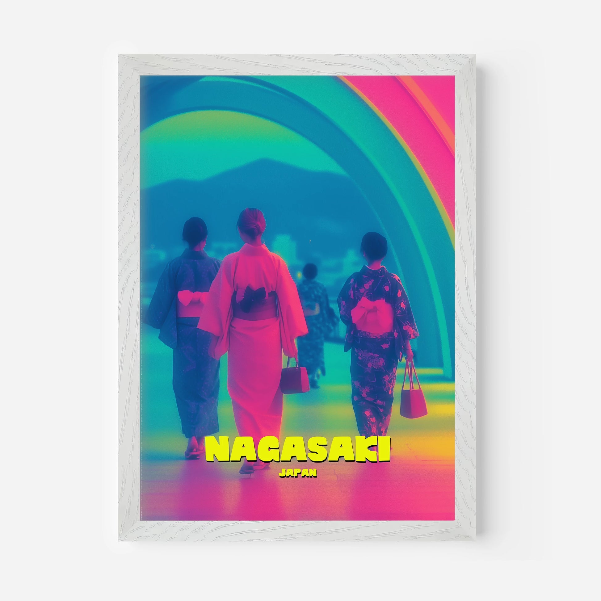 Celebrate tradition and modernity with this Nagasaki travel poster. Featuring women in colourful kimonos walking beneath a glowing rainbow arch, this design blends cultural richness with bold neon-inspired tones of pink, blue, and yellow. The striking mix of colours makes it a captivating focal point for any room. Perfect for collectors of travel art and lovers of Japanese culture. Professionally printed with exceptional detail.