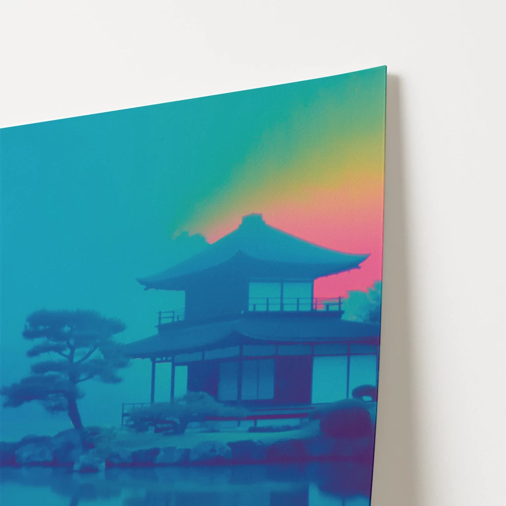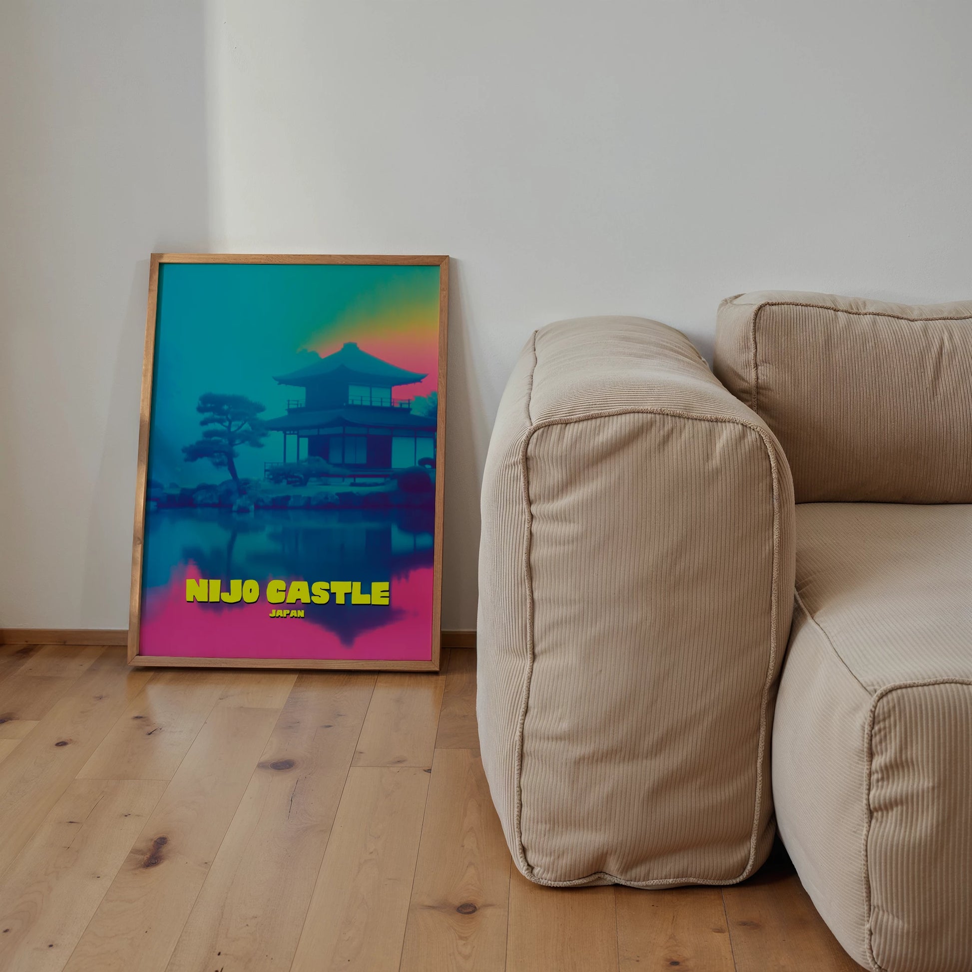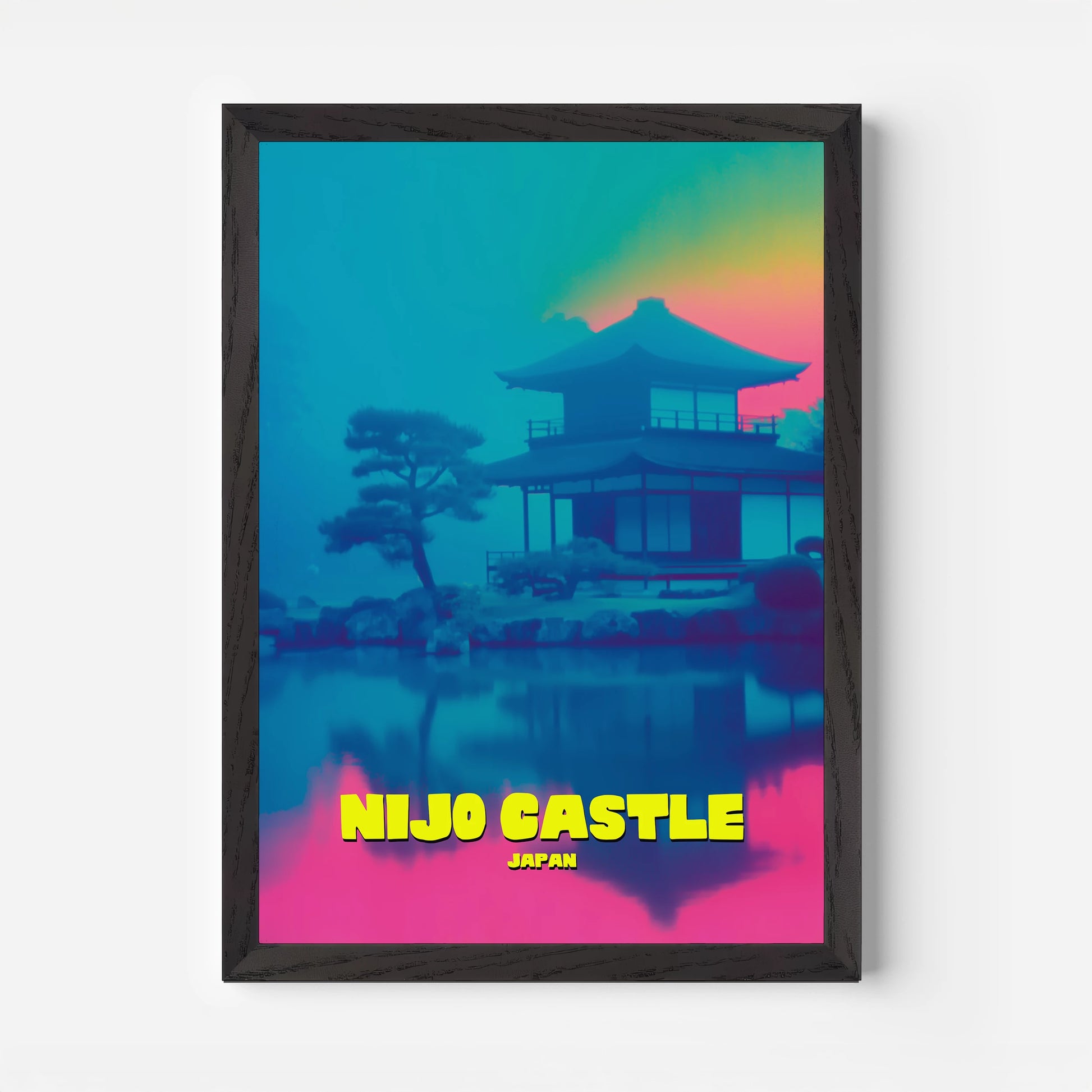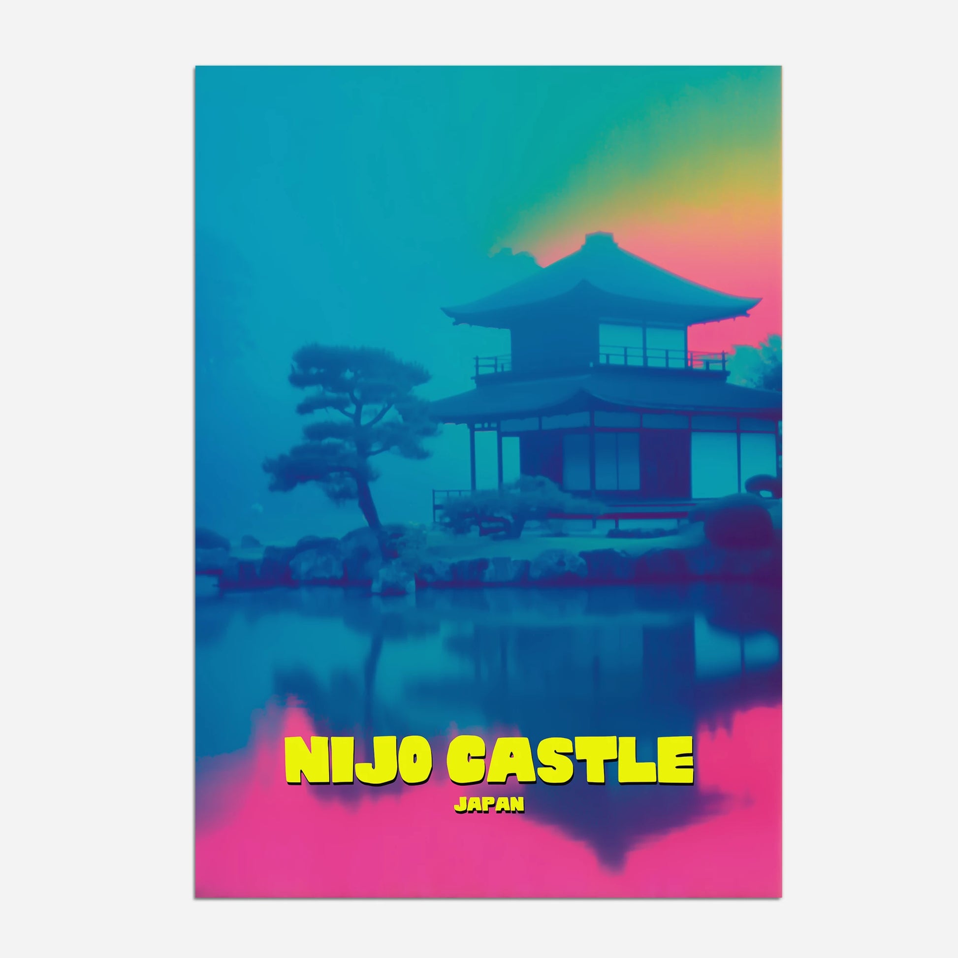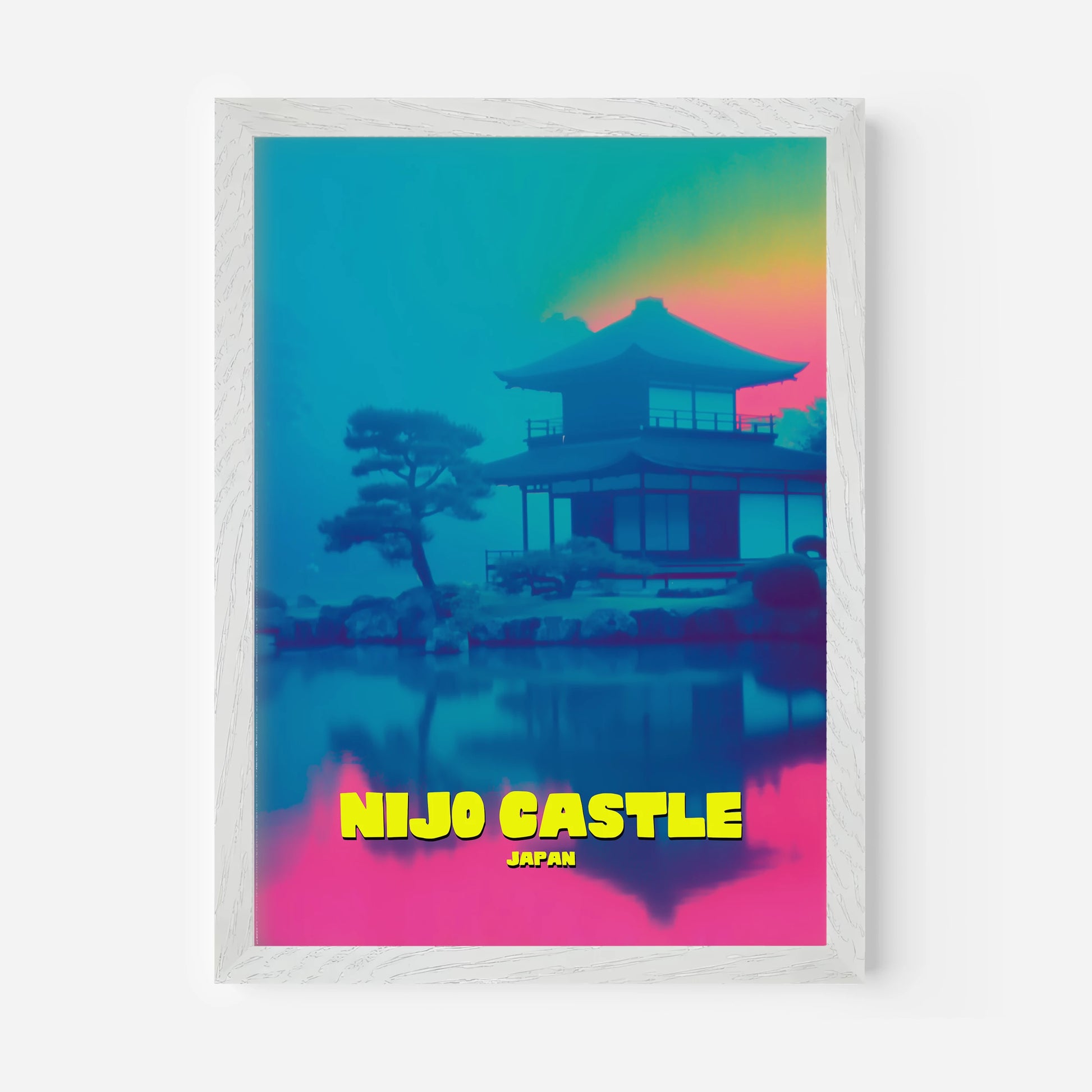 Celebrate Kyoto’s history with this Nijo Castle travel poster, showcasing one of Japan’s UNESCO World Heritage sites. The reflective waters and classic architecture are bathed in a mix of turquoise blues, magenta pinks, and golden sunset tones. This modern take on a timeless landmark blends culture with contemporary colour. A perfect piece for adding depth and vibrancy to your interior. A unique gift for Japan enthusiasts and castle lovers.