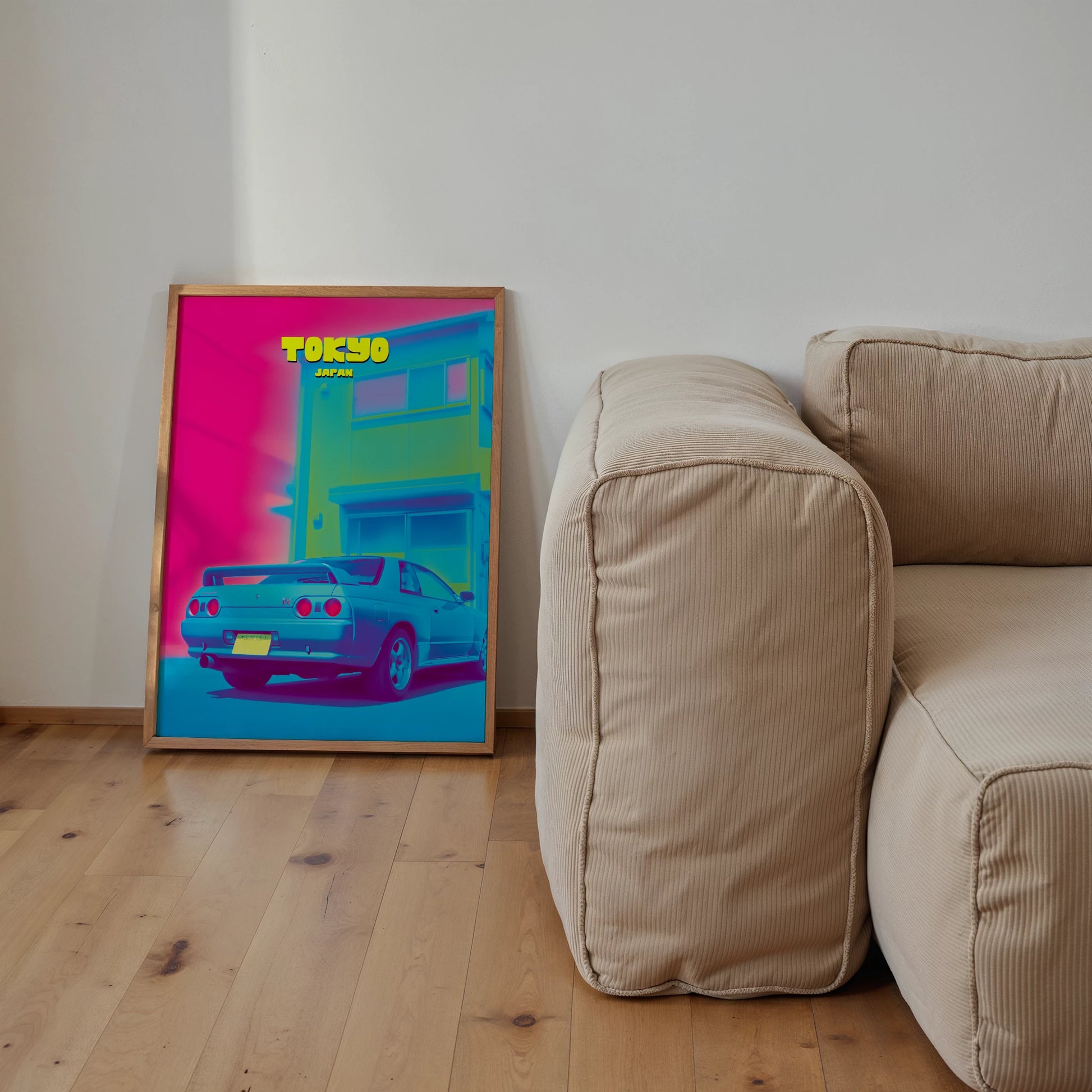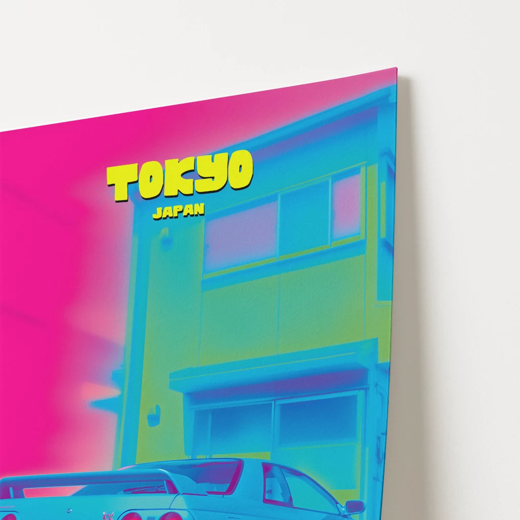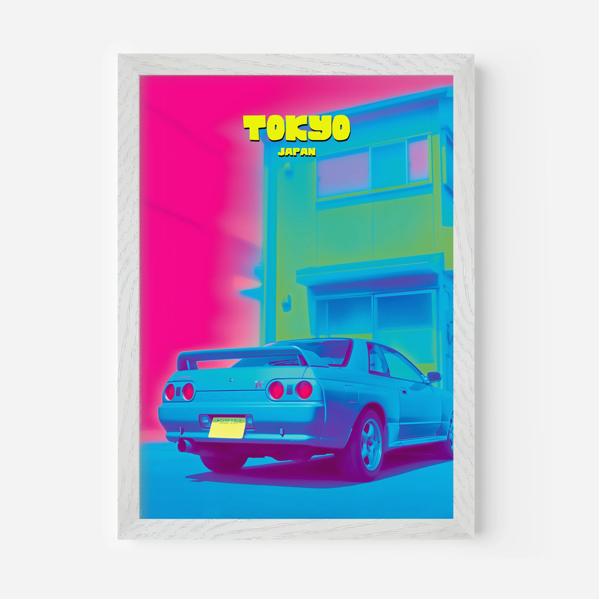 Celebrate modern Tokyo with this bold travel poster featuring the iconic Nissan Skyline. The car is set against a backdrop of neon pinks, aqua blues and bright yellows, giving it a retro-futuristic vibe. A perfect blend of Japanese culture, automotive history and contemporary design. Ideal for car lovers, city enthusiasts and anyone who wants statement wall art. A dynamic piece that captures Tokyo’s fast-paced energy.