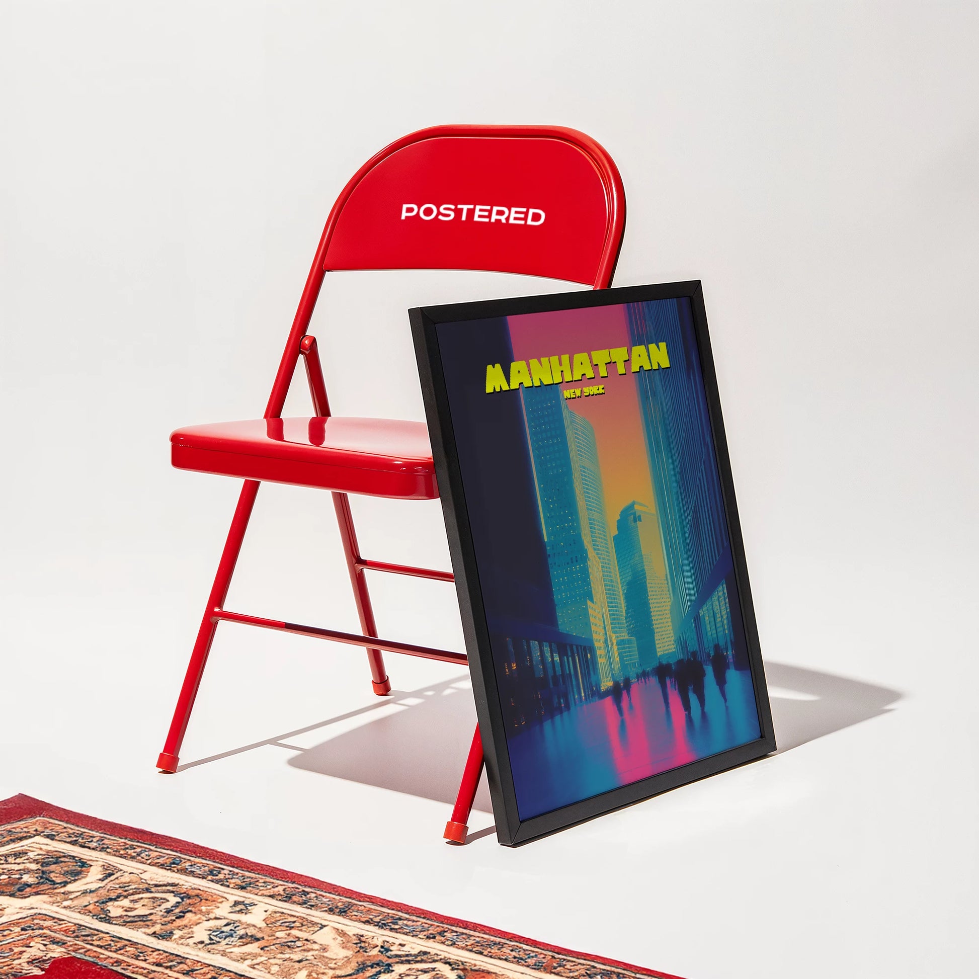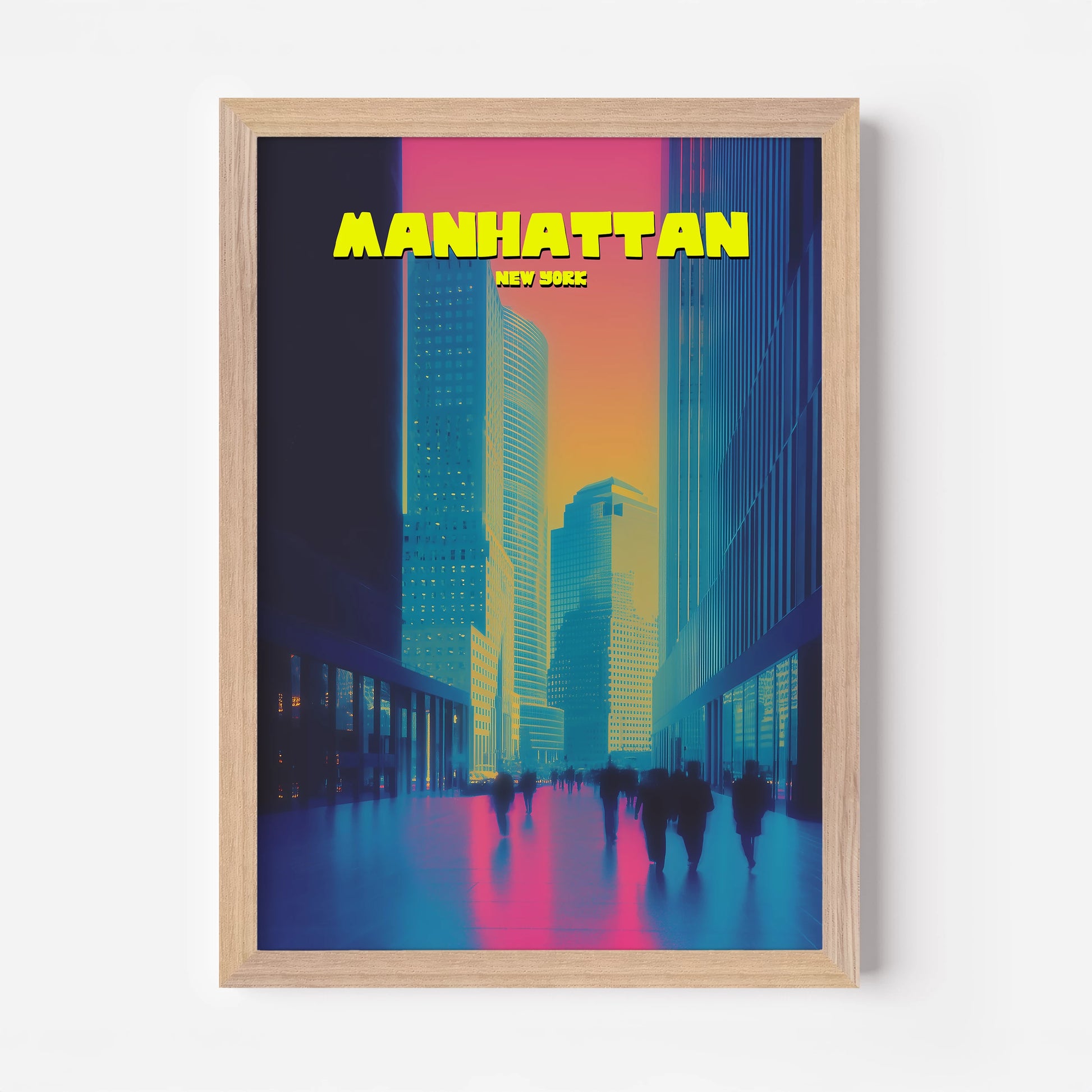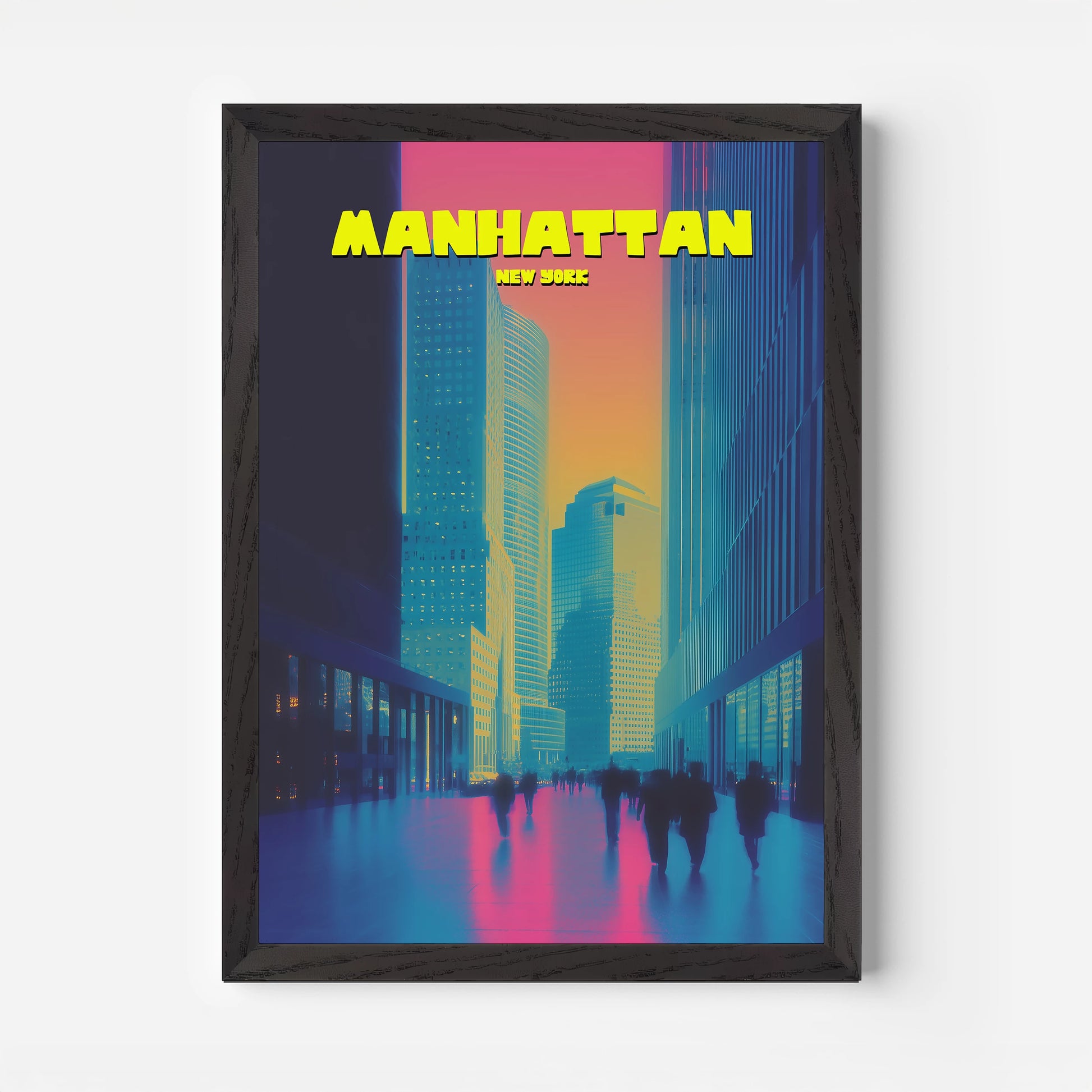 Bring the buzz of the Financial District into your home with this dynamic Manhattan travel poster. Showcasing towering skyscrapers and the silhouettes of bustling commuters, it captures the heartbeat of New York City at golden hour. The striking neon-inspired colour palette adds a modern, artistic twist to the urban scene. Perfect for fans of architecture, cityscapes, and contemporary art prints. Printed on premium-quality paper, this Manhattan travel poster makes a bold statement in any living space or office.