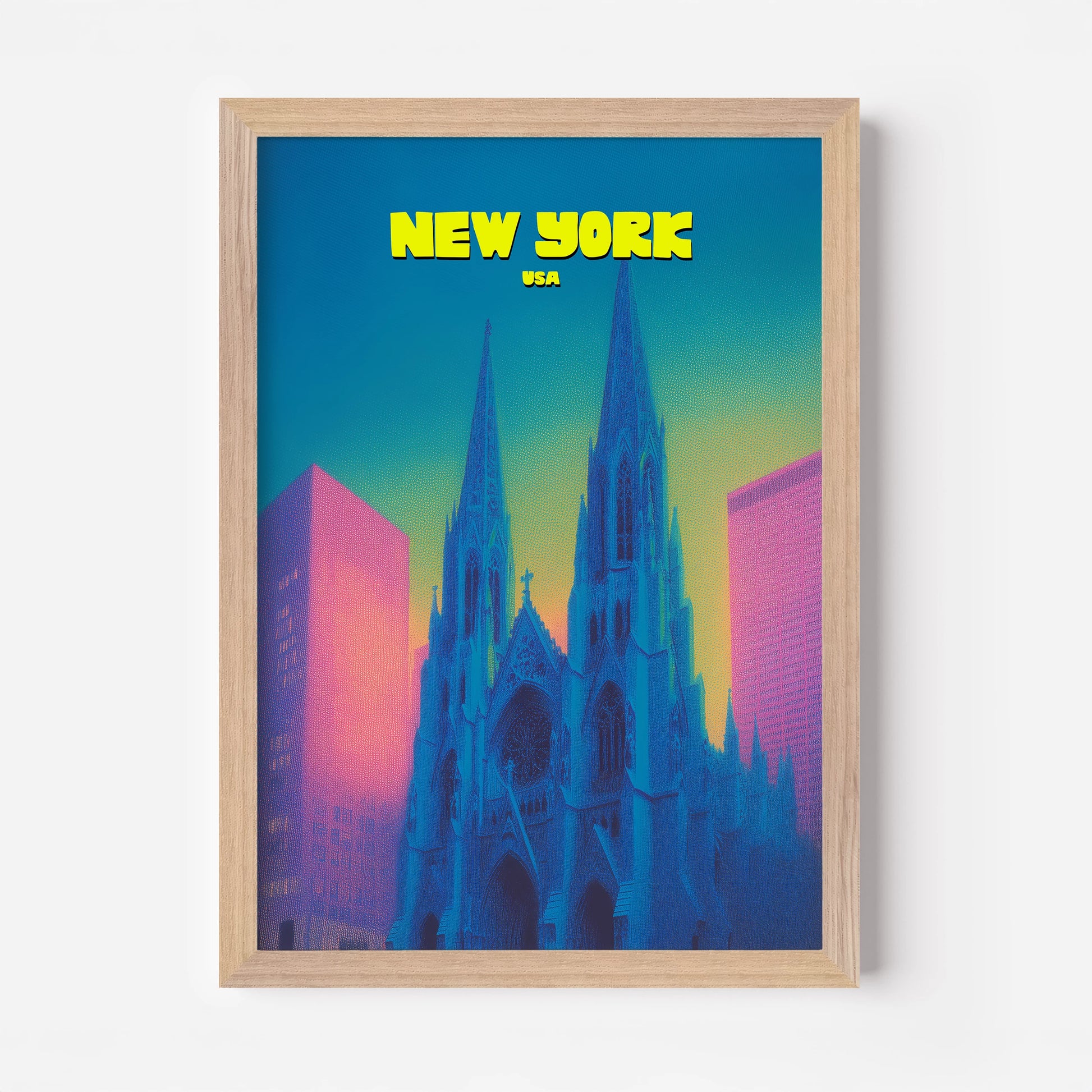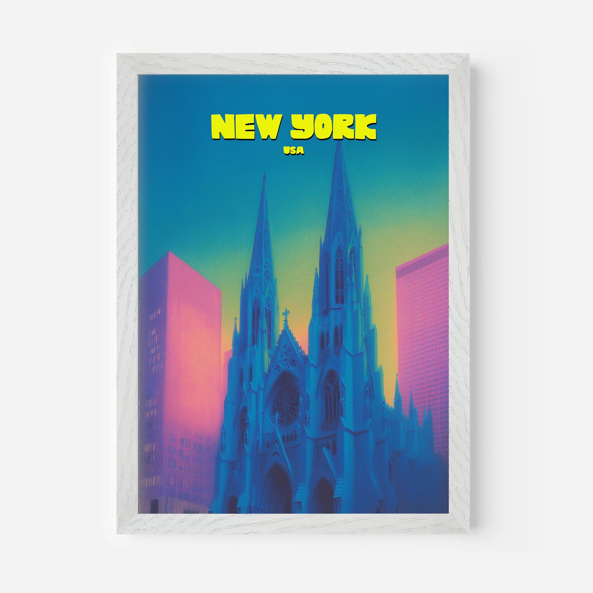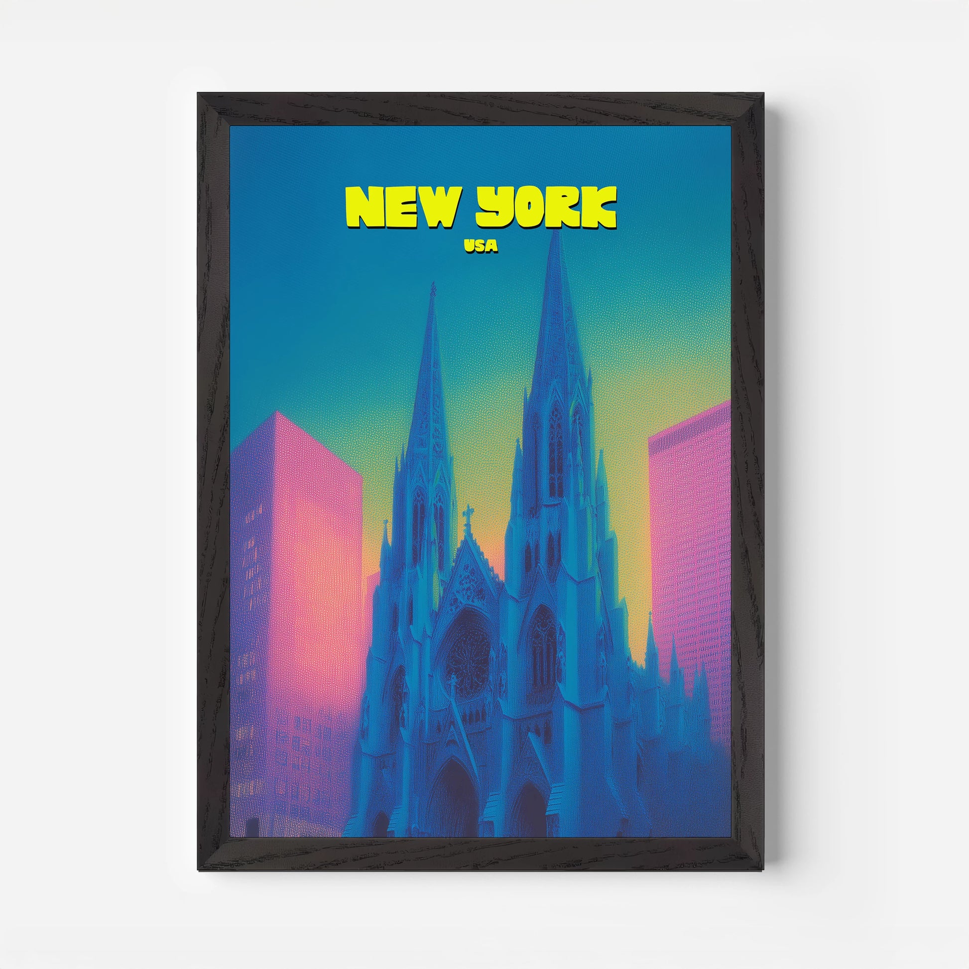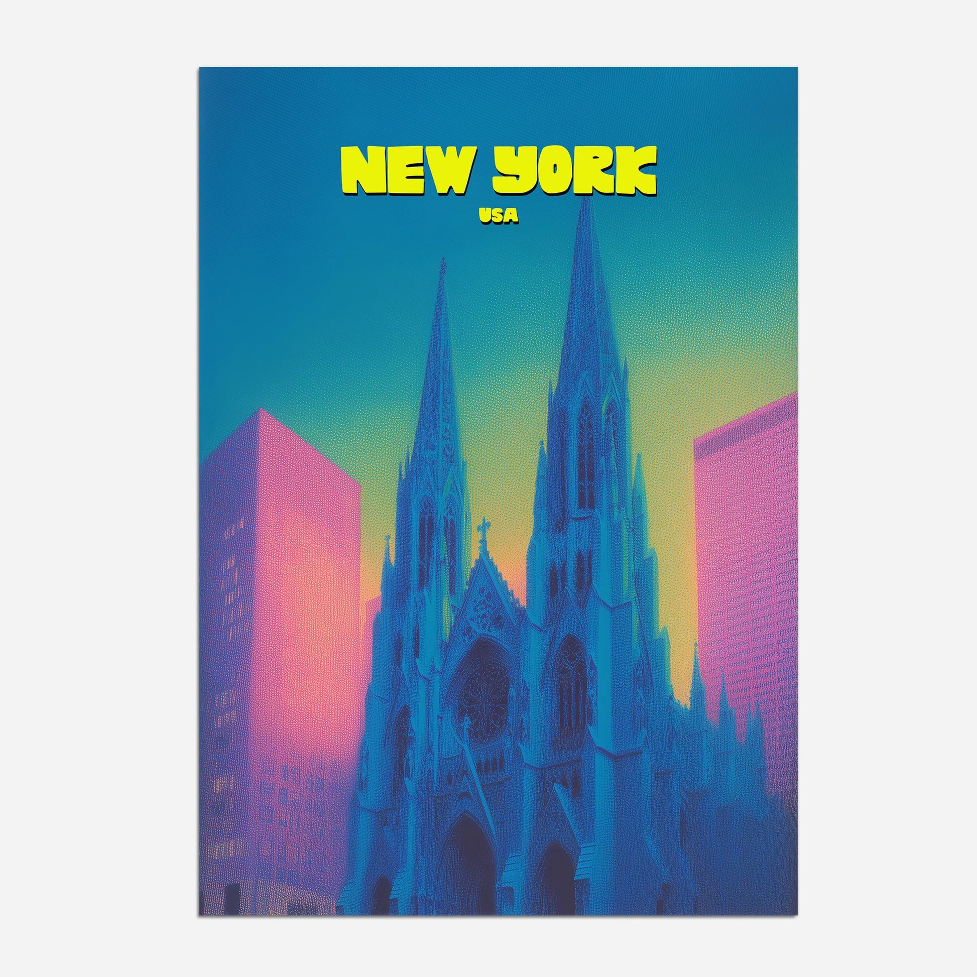 Celebrate one of New York’s most iconic landmarks with this striking St. Patrick’s Cathedral travel poster. The cathedral’s soaring spires are beautifully framed by modern skyscrapers, set against a vivid gradient sky of pink, yellow, and blue. Perfect for lovers of architecture, history, and the city’s unique blend of old and new. This travel poster brings a touch of Gothic grandeur to any interior. An ideal gift for New York enthusiasts and design lovers alike.
