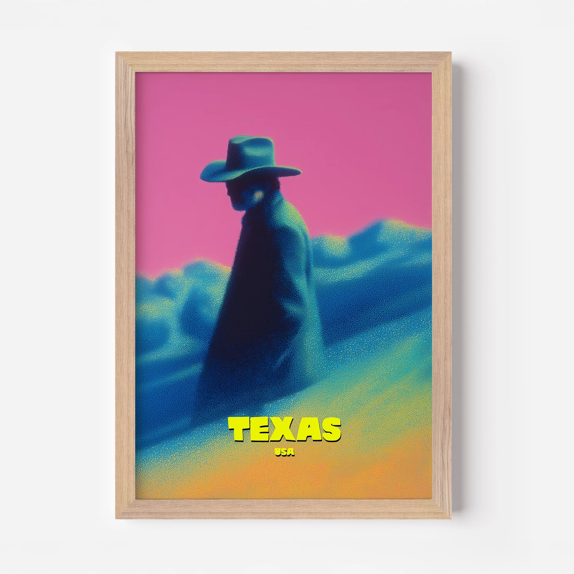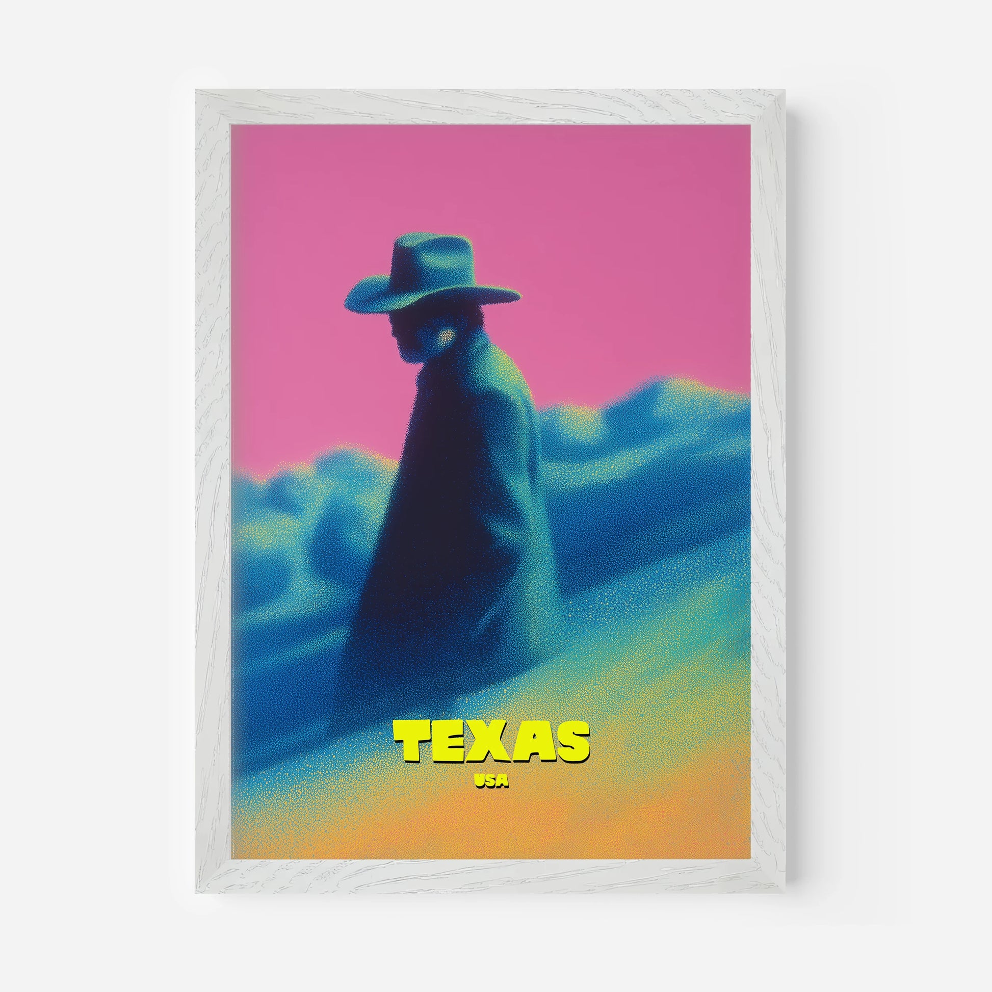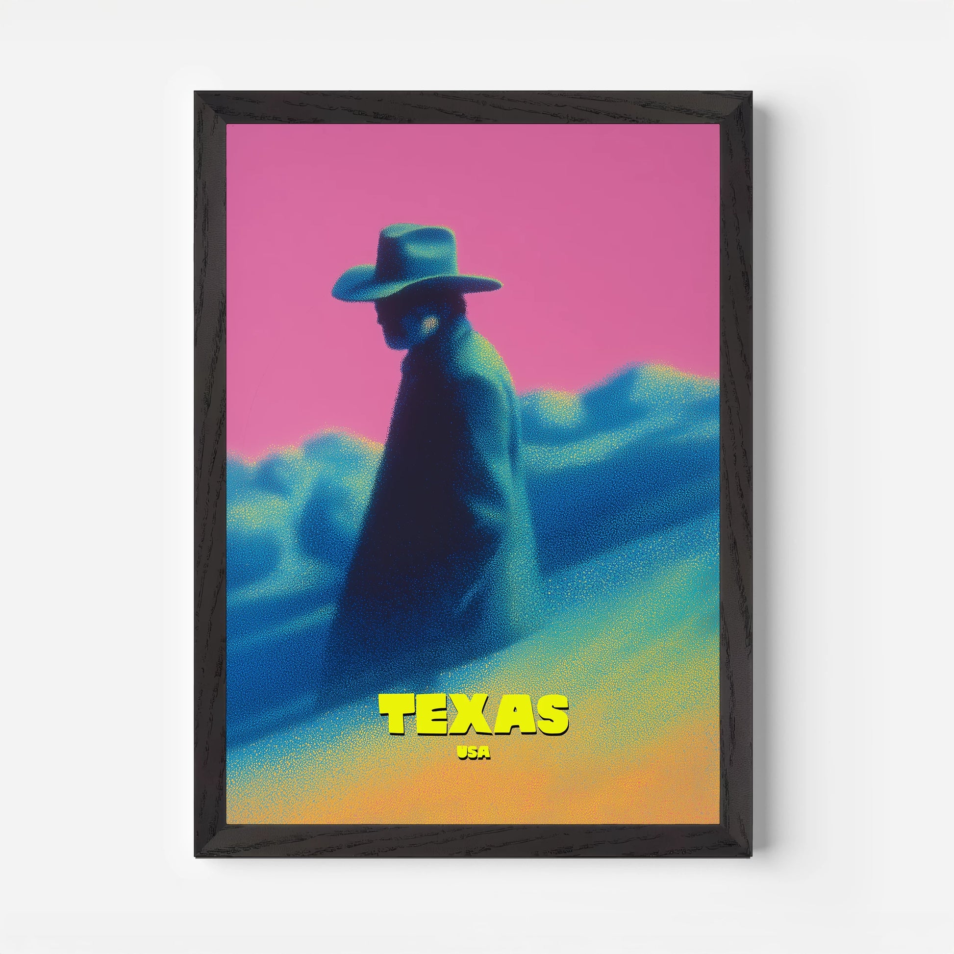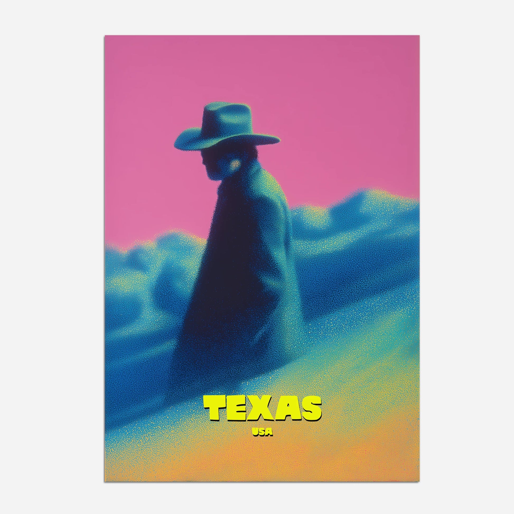 Capture the rugged spirit of the American West with this striking Texas travel poster. Featuring a lone cowboy silhouetted against a vivid desert backdrop, it evokes the timeless allure of wide-open landscapes and frontier heritage. Perfect for lovers of Western culture, bold artwork, or unique statement pieces, this print brings a sense of adventure into any space. Whether you’ve explored Texas yourself or simply admire its iconic imagery, this Texas travel poster is a bold celebration of the Lone Star State’s enduring charm.