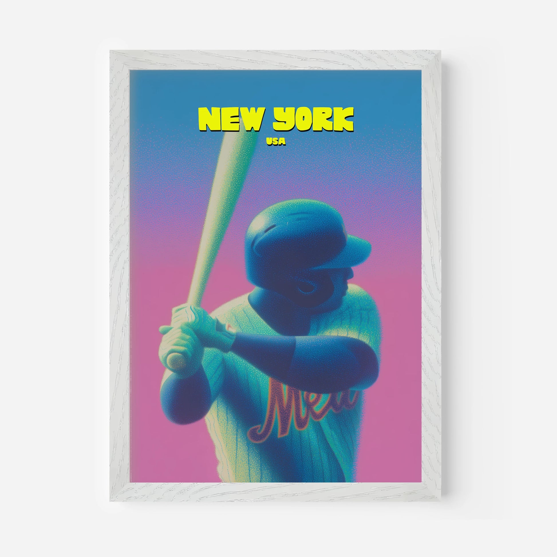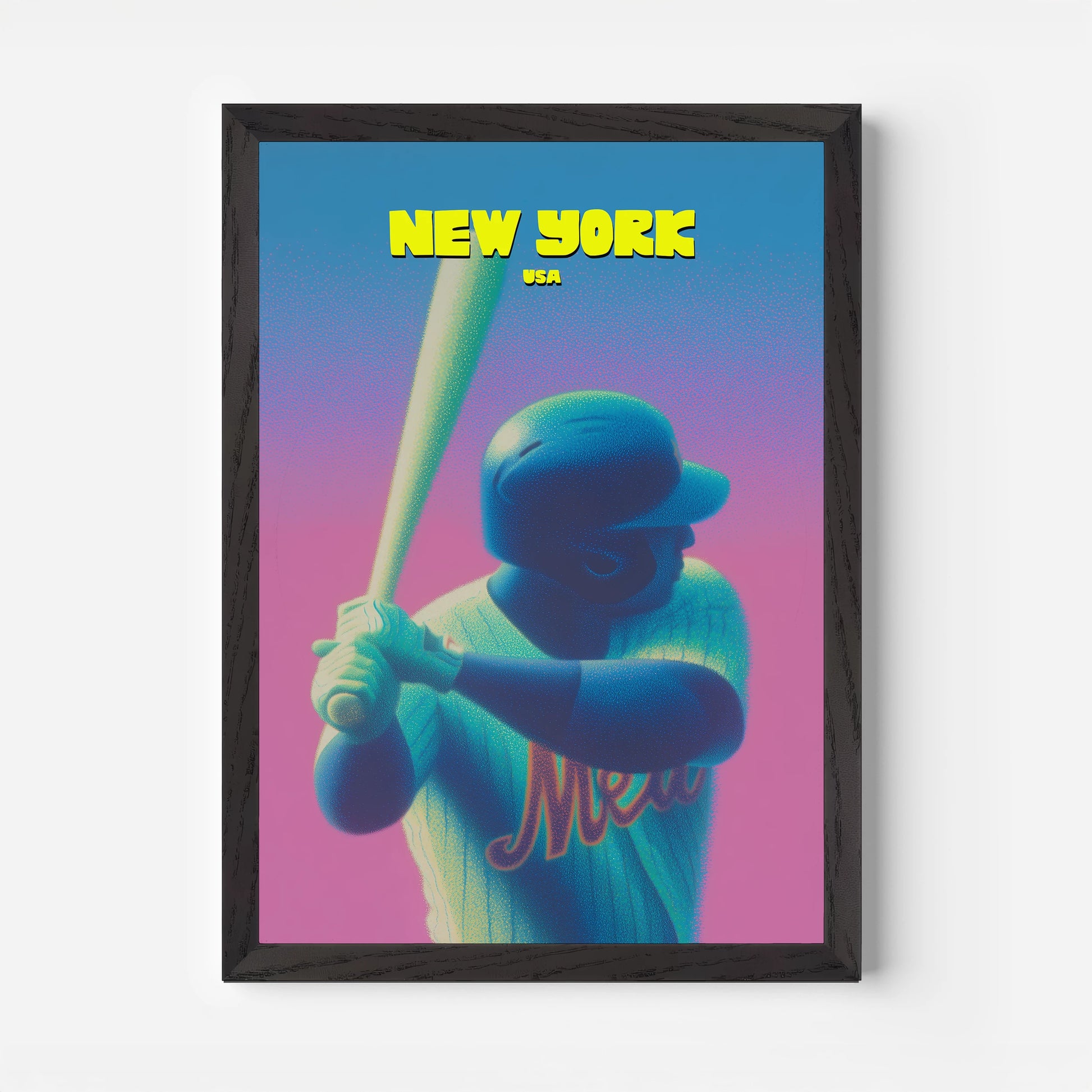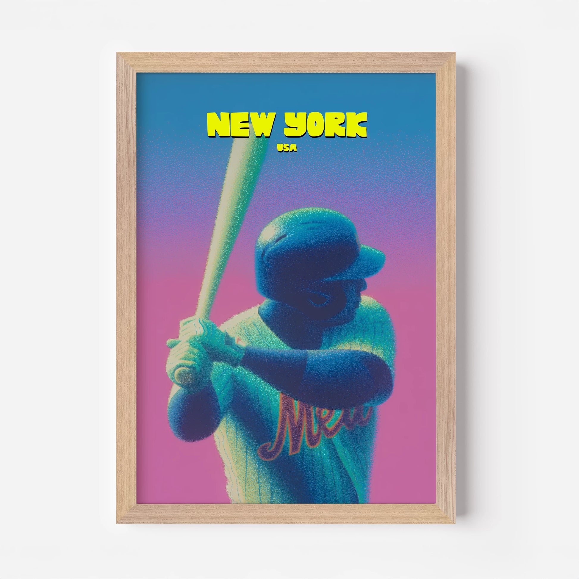 Celebrate New York’s sporting spirit with this dynamic travel poster featuring a New York Mets baseball player ready to swing. The bold mix of pink, blue, and green tones creates a striking retro-modern aesthetic, perfect for sports enthusiasts and fans of the Big Apple alike. Capturing the energy and anticipation of America’s favourite pastime, this poster brings a slice of New York culture into any room. Printed on high-quality paper for vibrant colours and a lasting finish, it’s ideal for adding personality to your home, office, or sports-themed space. A must-have travel poster for baseball lovers and New York devotees.