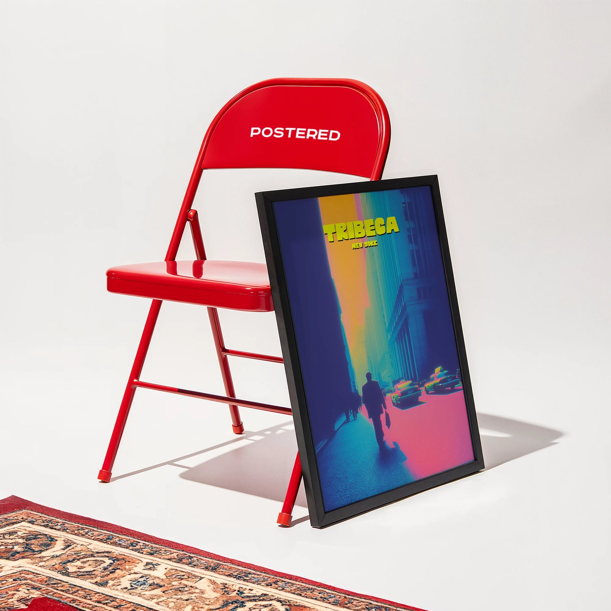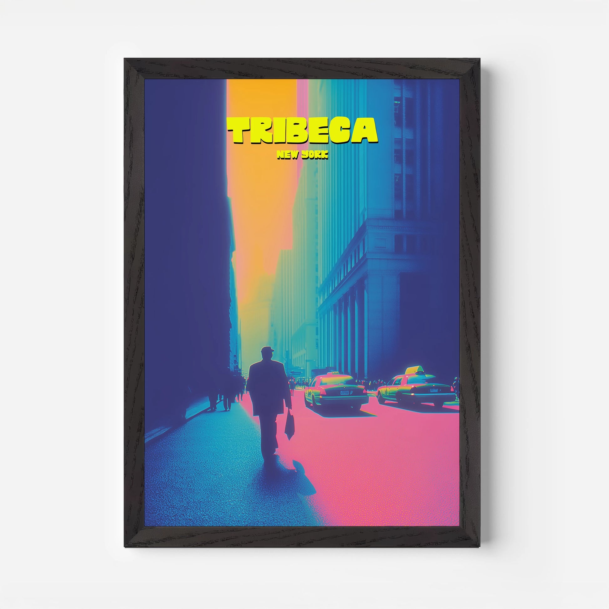 Capture the dynamic spirit of downtown New York with this bold Tribeca travel poster. Featuring a striking neon-lit street scene with iconic yellow taxis and a silhouetted figure, it perfectly embodies the energy and sophistication of the area. The vibrant gradient colours bring a modern twist to classic city imagery, making it a standout piece for any wall. Printed on premium quality paper, this Tribeca travel poster is ideal for lovers of urban art, cityscapes, and contemporary design.