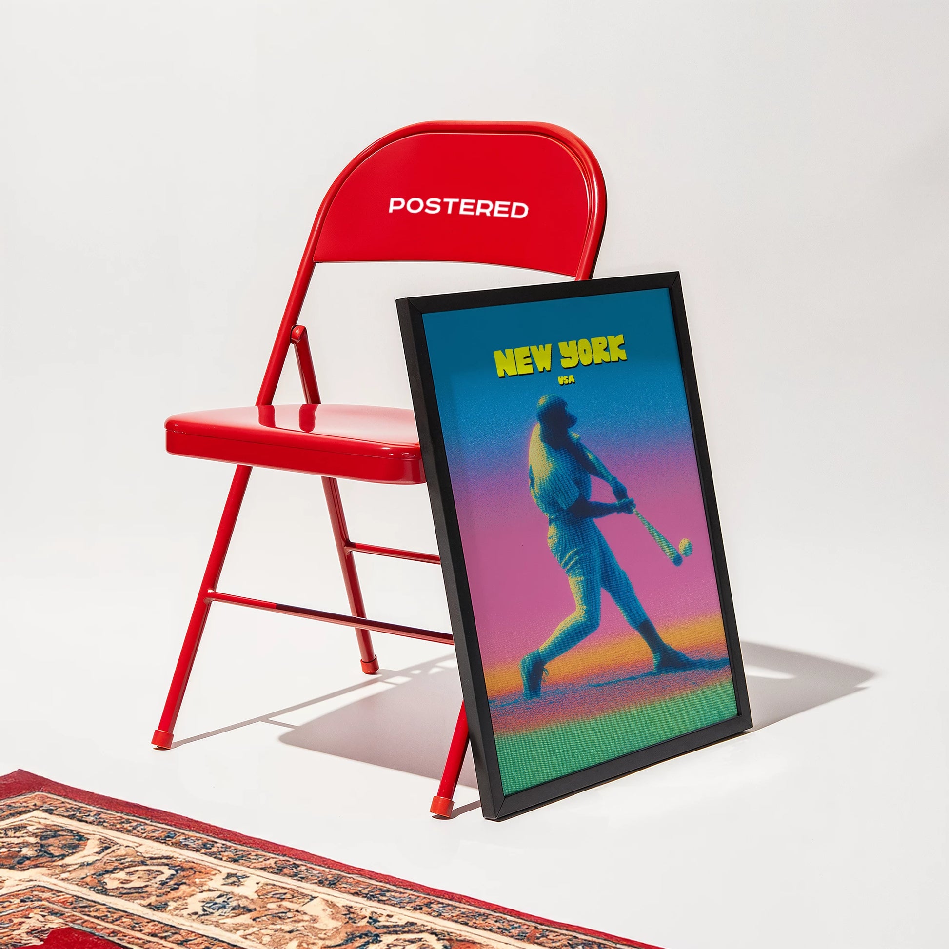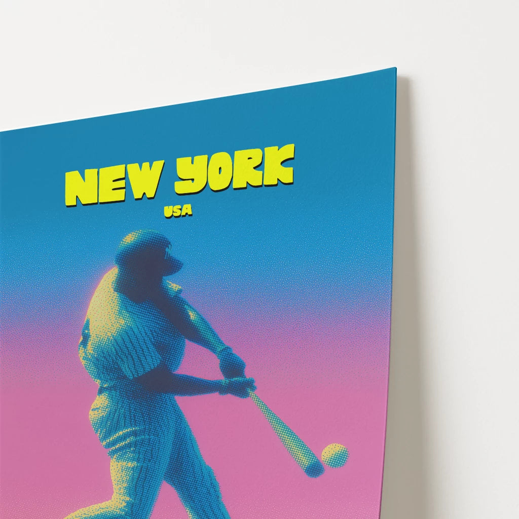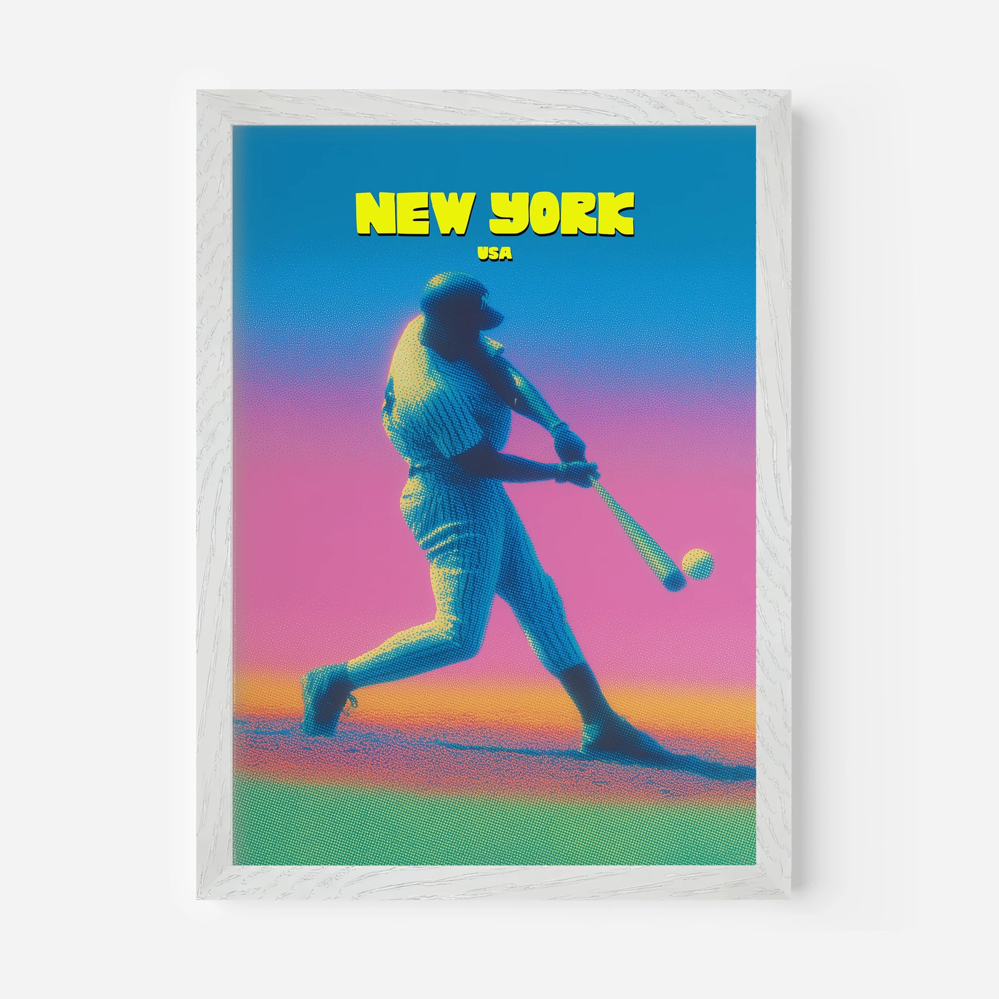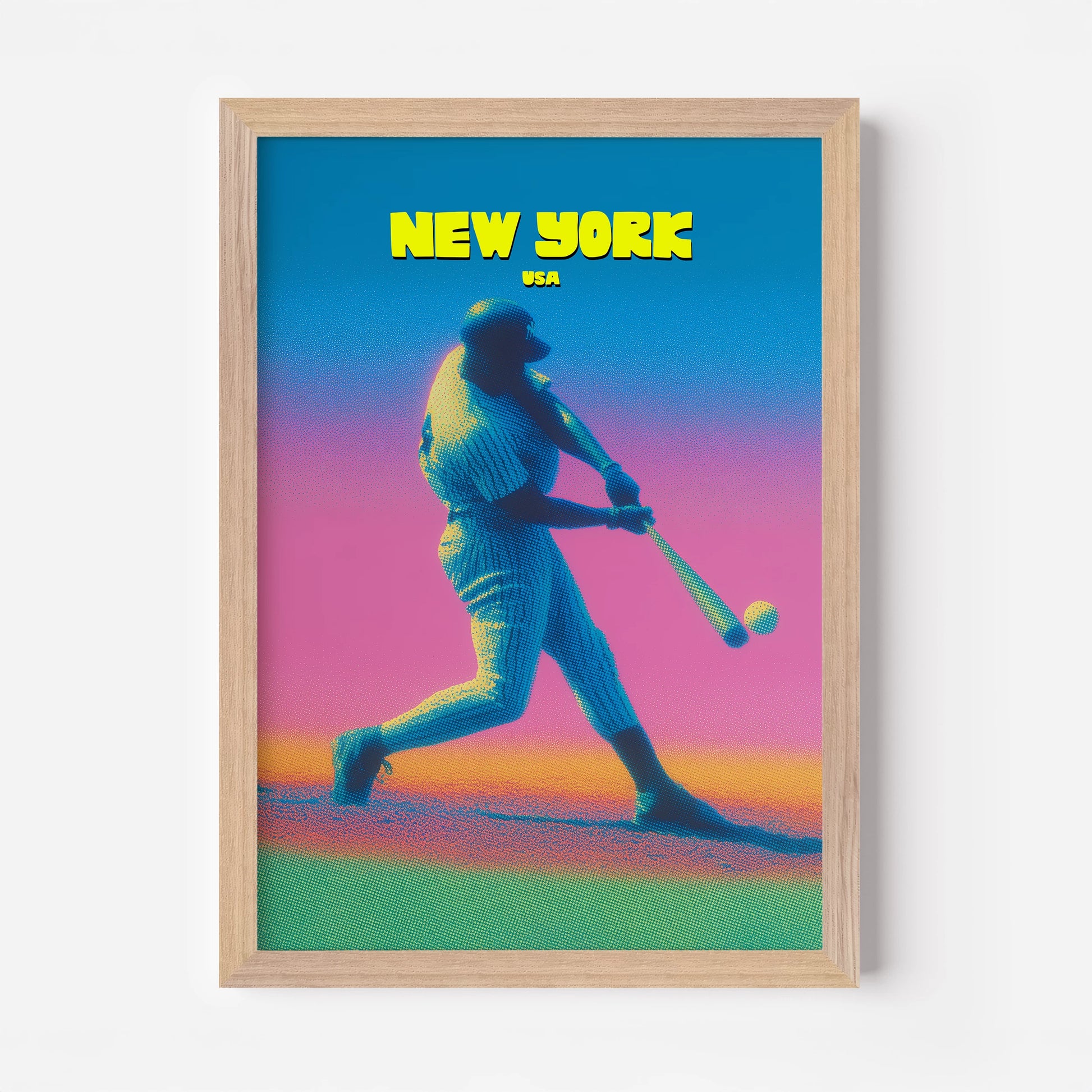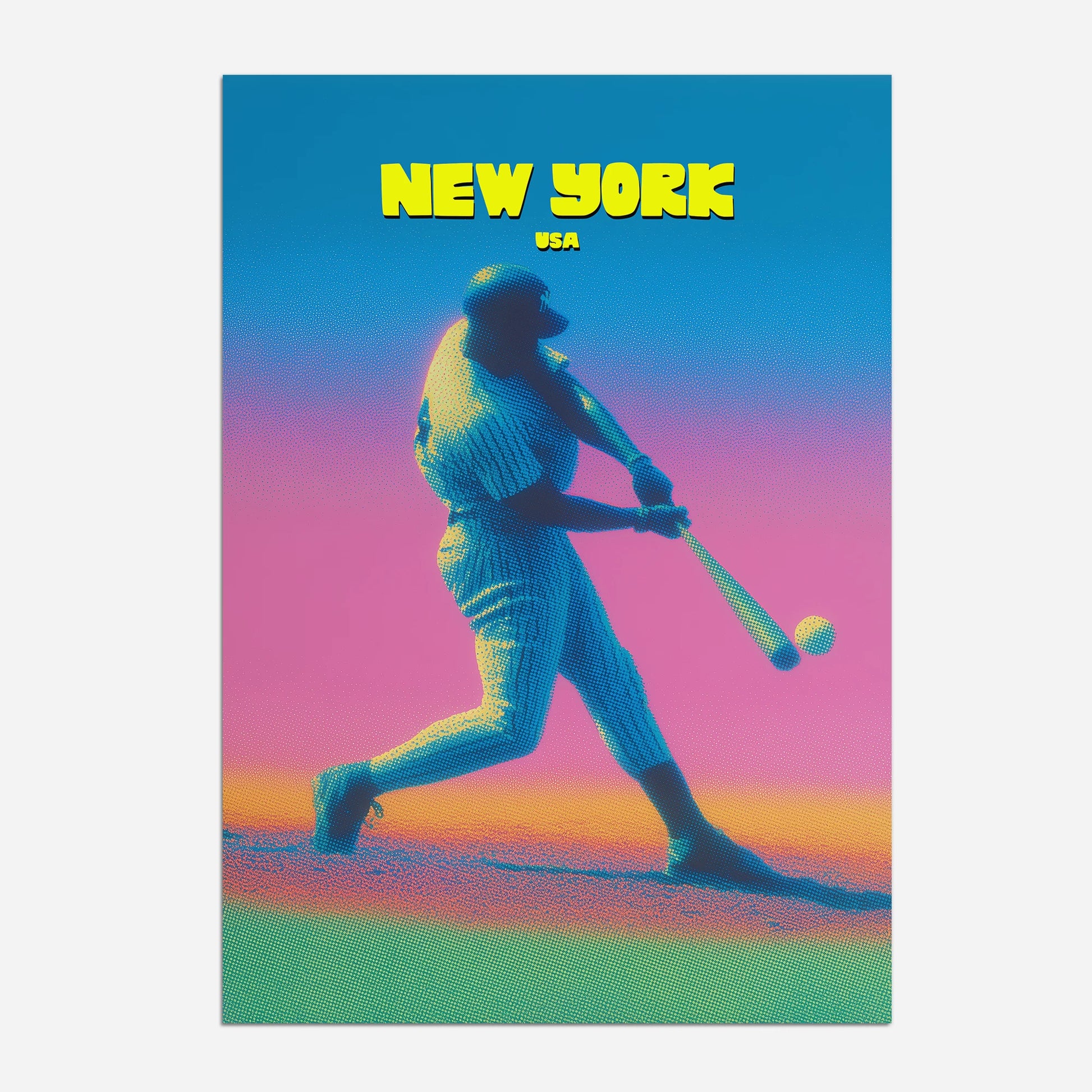 Celebrate the timeless sport of baseball with this striking New York Yankees travel poster, showcasing a player mid-swing against a vibrant retro-gradient backdrop. The bold halftone design blends nostalgia with contemporary style, making it an eye-catching piece for any sports fan or lover of New York City culture. Perfect for adding a pop of colour and energy to your home, office, or games room. Printed on premium-quality paper to ensure vivid, lasting colours. A must-have travel poster for those who cherish the spirit and history of the Big Apple’s most iconic team.