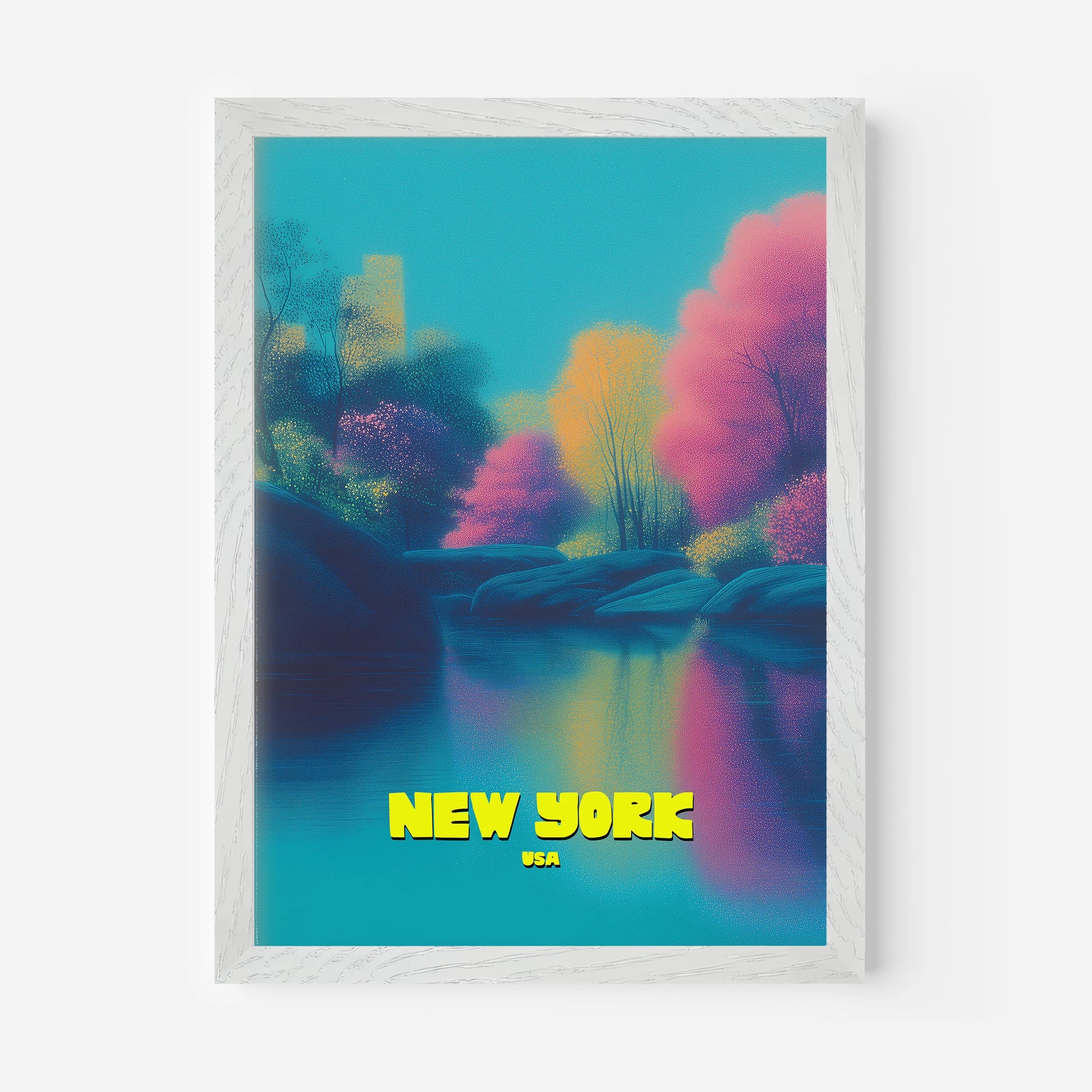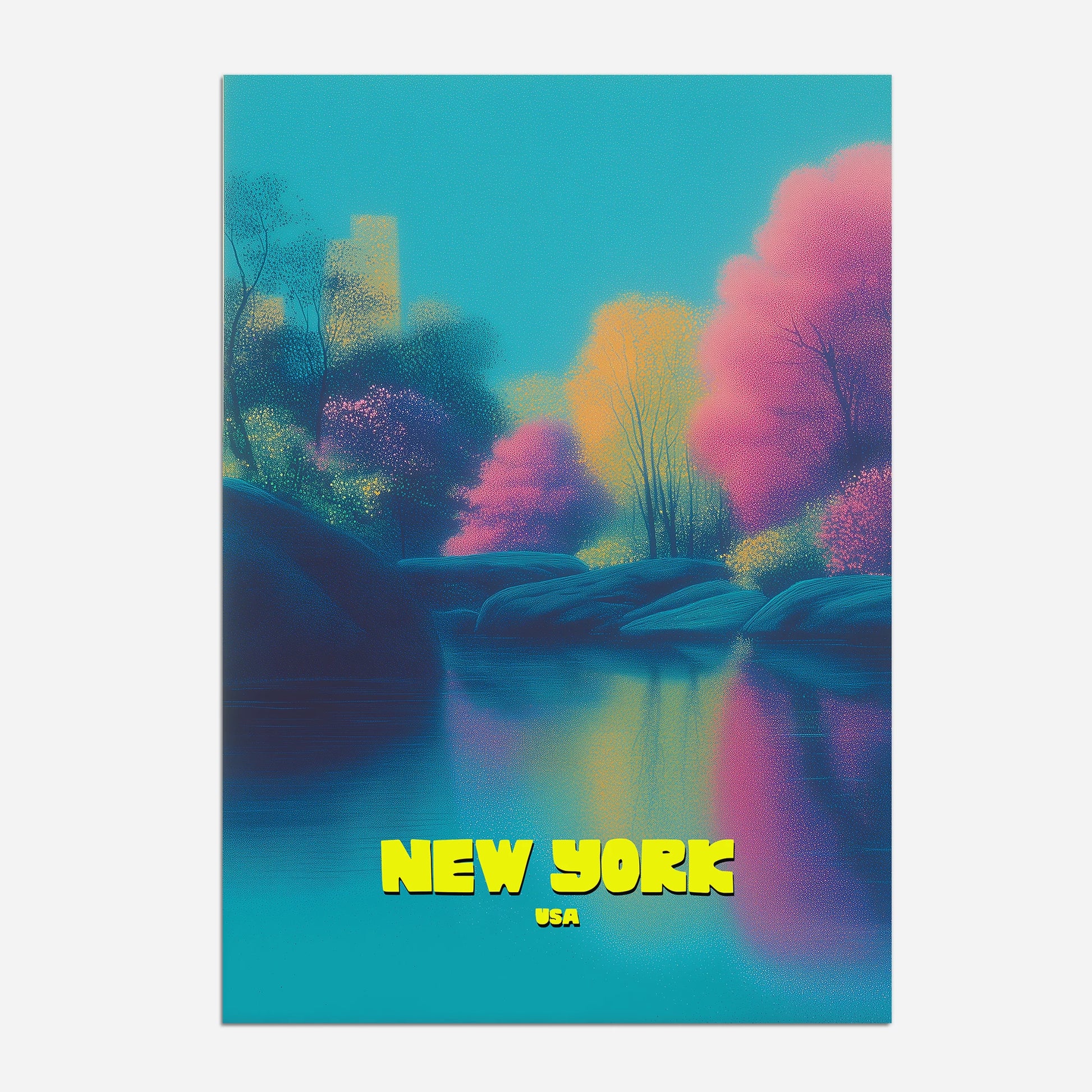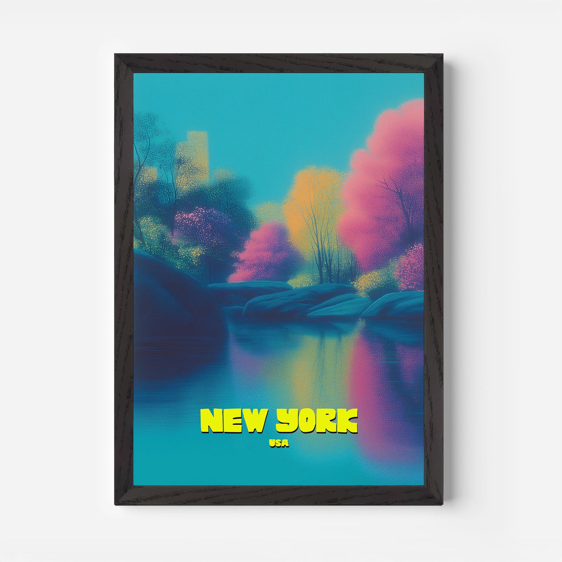 Bring a burst of colour to your walls with this vibrant New York travel poster, showcasing Central Park in a dreamy, neon-inspired palette. Lush pink, yellow, and purple trees reflect beautifully in the calm waters, with the city skyline peeking subtly in the background. Perfect for adding a playful, contemporary twist to your home or office décor. A unique gift for art lovers, travellers, and fans of the Big Apple. A striking addition to any modern travel poster collection.