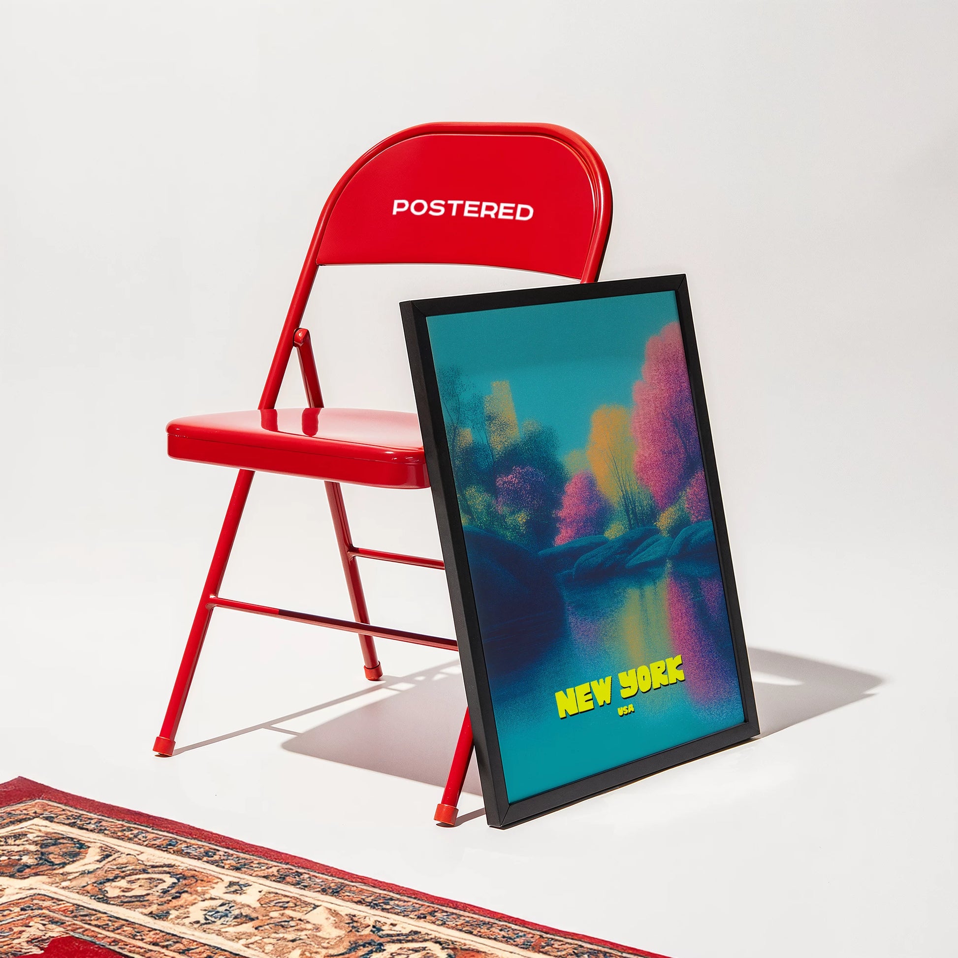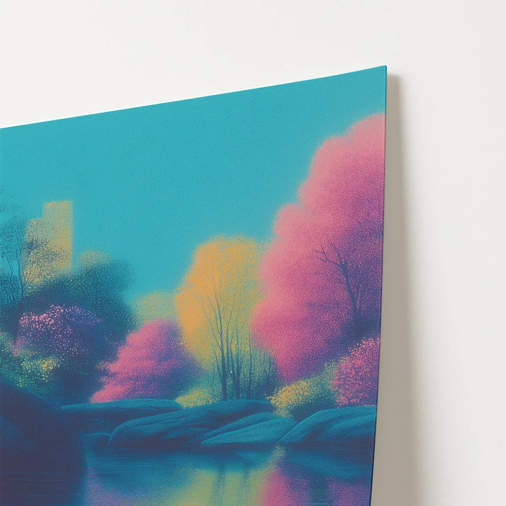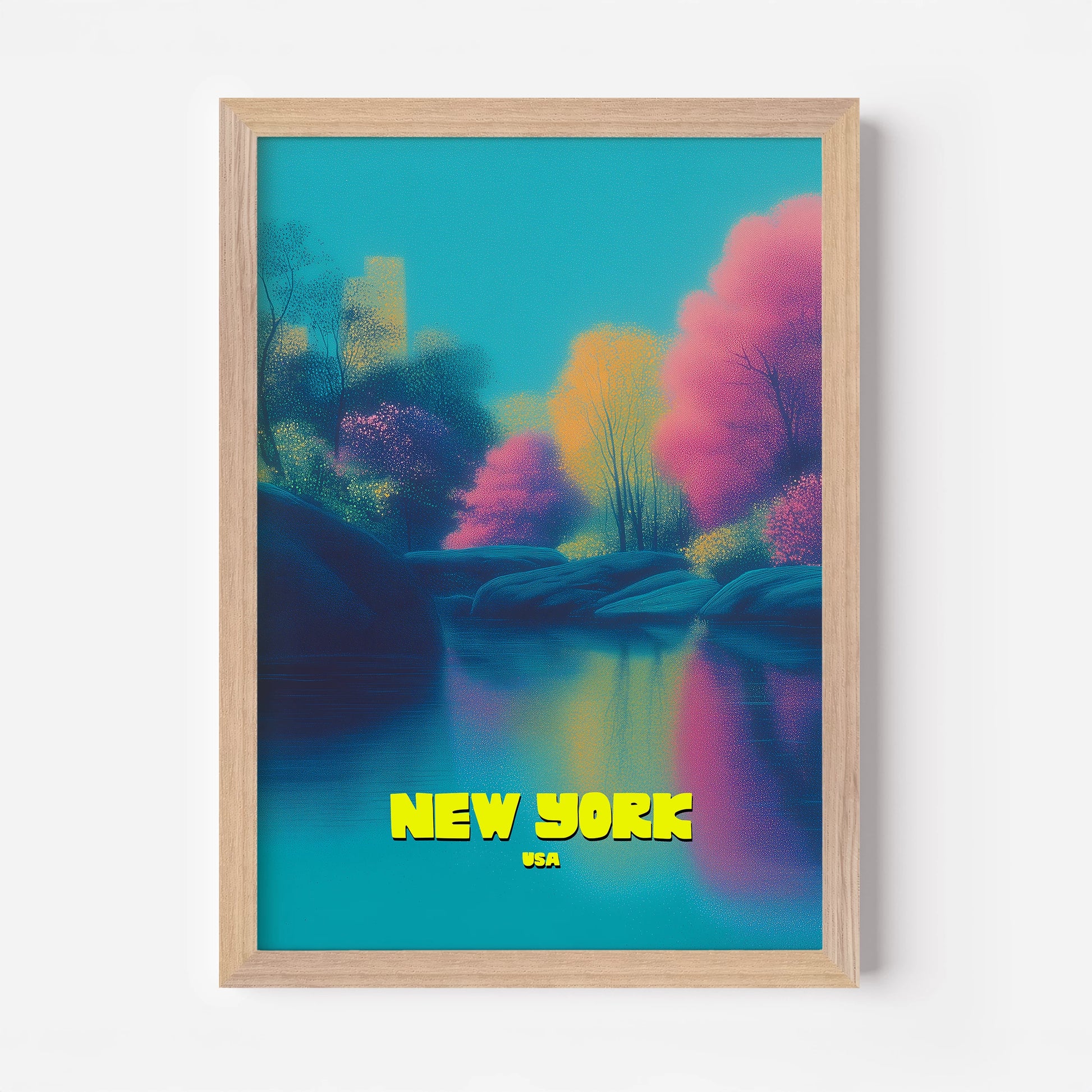 Bring a burst of colour to your walls with this vibrant New York travel poster, showcasing Central Park in a dreamy, neon-inspired palette. Lush pink, yellow, and purple trees reflect beautifully in the calm waters, with the city skyline peeking subtly in the background. Perfect for adding a playful, contemporary twist to your home or office décor. A unique gift for art lovers, travellers, and fans of the Big Apple. A striking addition to any modern travel poster collection.