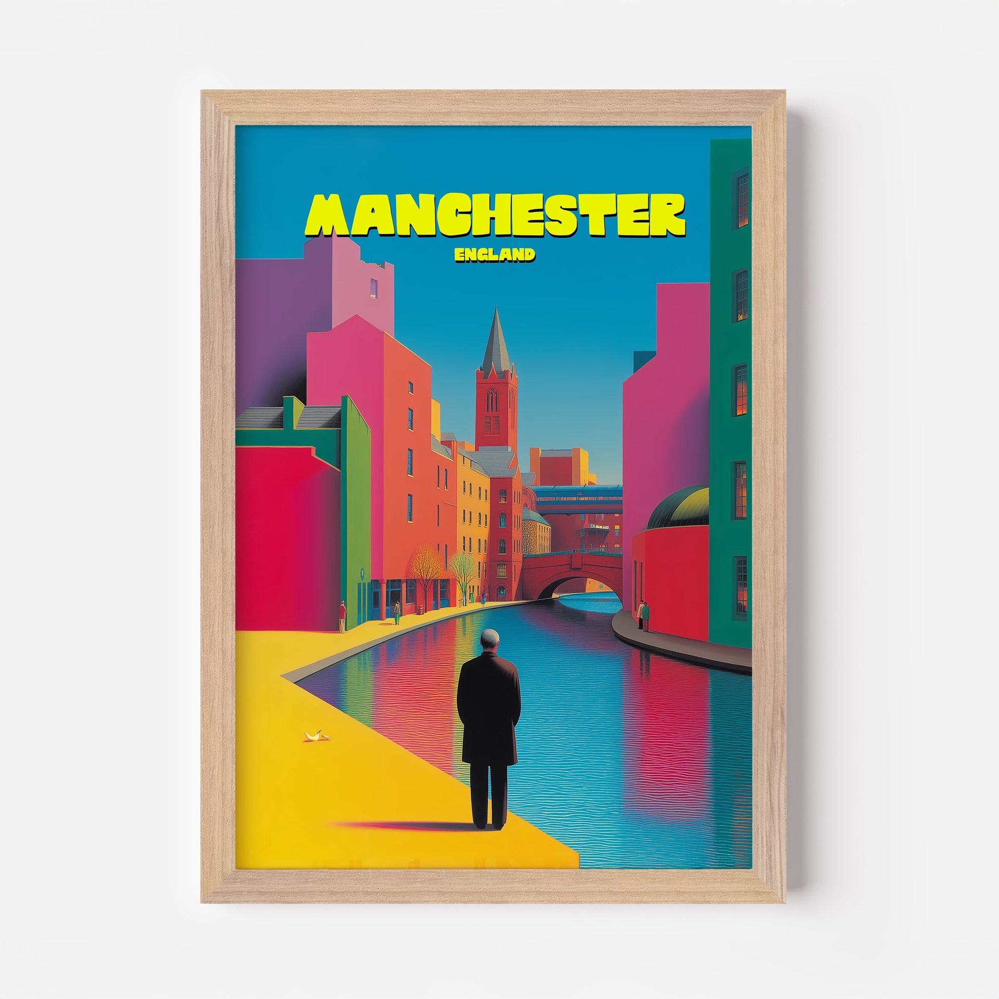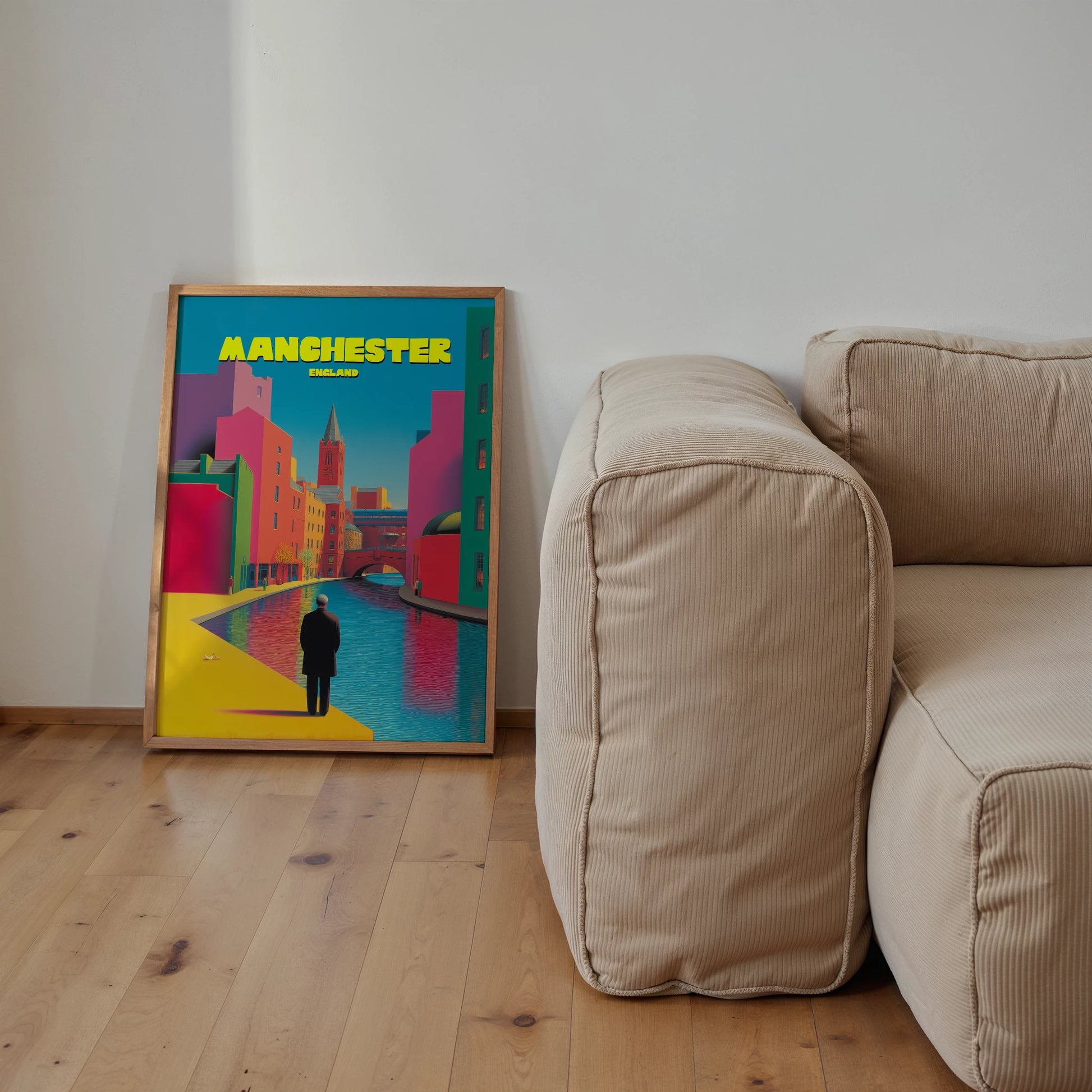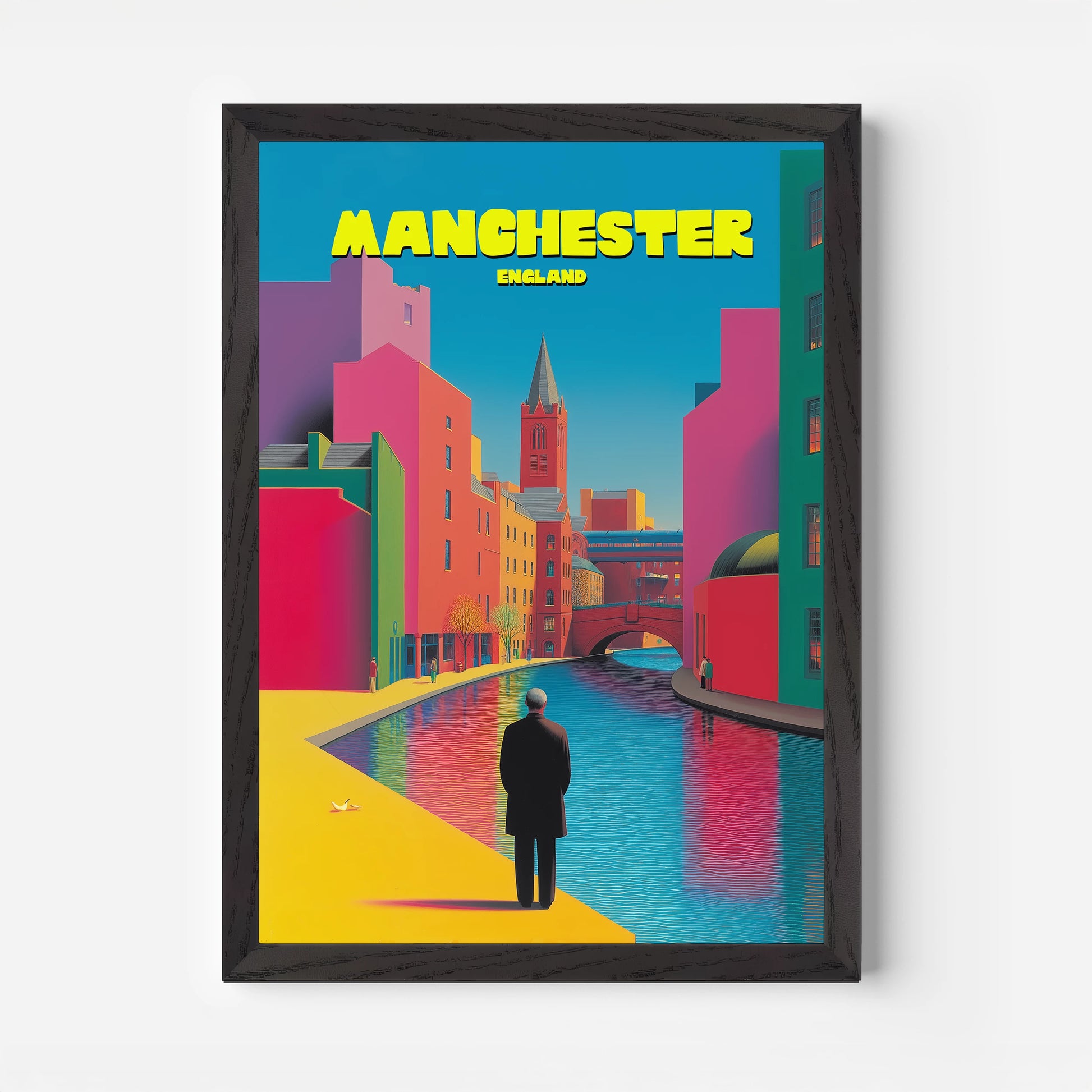 Capture the charm of the waterways with this Manchester canal travel poster. Featuring bold blocks of pink, orange, yellow, and green set against deep blue water, it offers a colourful reimagining of the city. The historic architecture and calm canal create a striking yet serene scene. A must-have for Manchester locals or anyone with ties to the city. Brighten your walls with this unique and stylish travel poster.