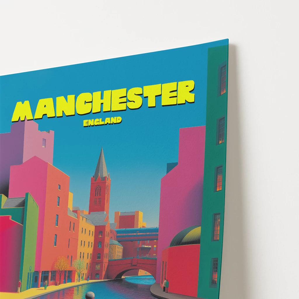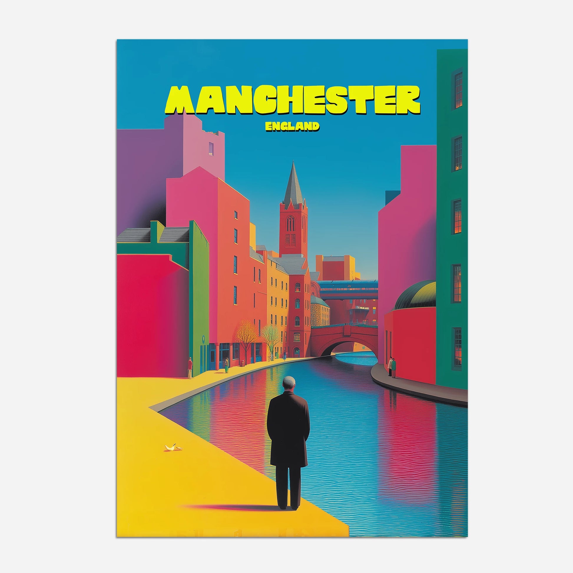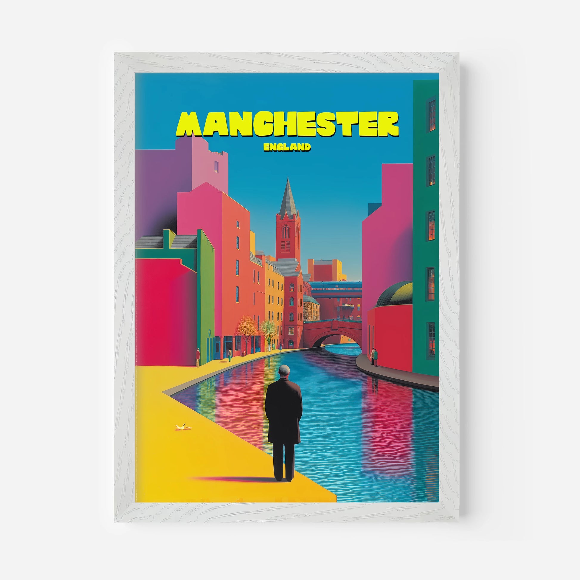 Capture the charm of the waterways with this Manchester canal travel poster. Featuring bold blocks of pink, orange, yellow, and green set against deep blue water, it offers a colourful reimagining of the city. The historic architecture and calm canal create a striking yet serene scene. A must-have for Manchester locals or anyone with ties to the city. Brighten your walls with this unique and stylish travel poster.